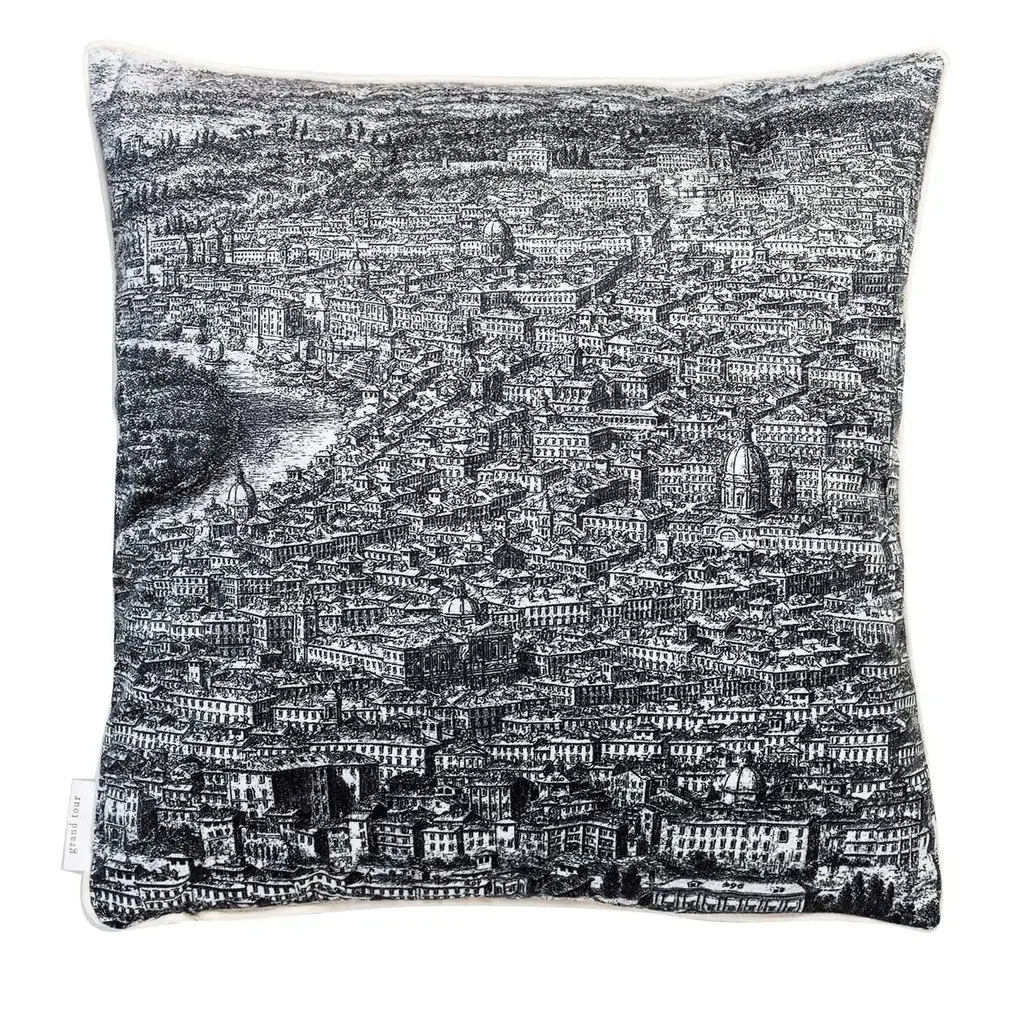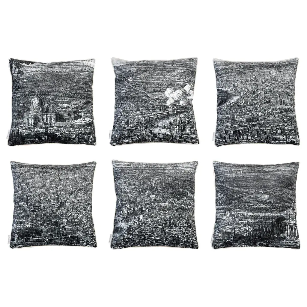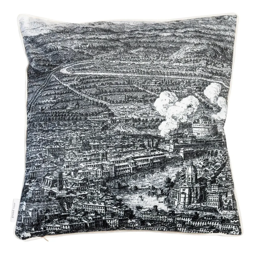 The Roma collection is a set of cushions that traces the homonymous ancient city. On one side, the houses and monuments follow one another in black and white over the entire surface, on the back the same portion of the landscape with the Roman hills and the sky explodes in the colors of the sunset.Pillow 6/6.
