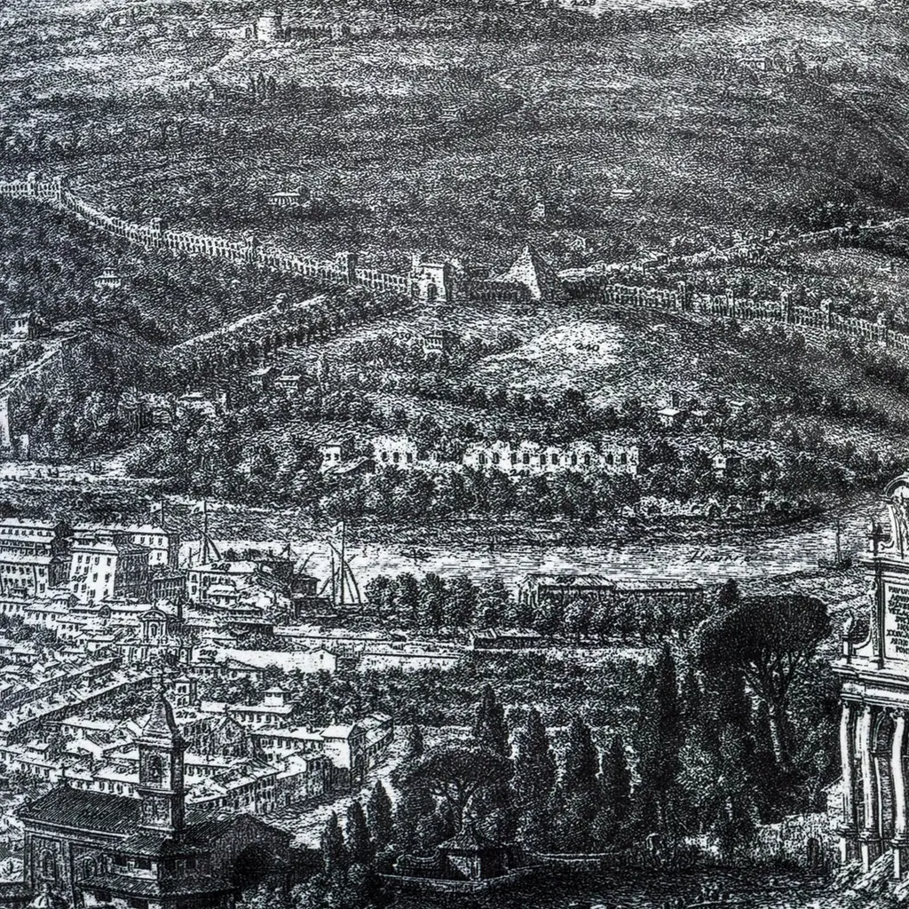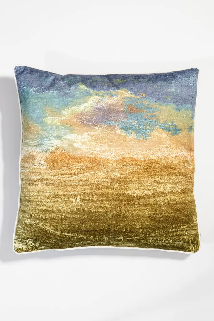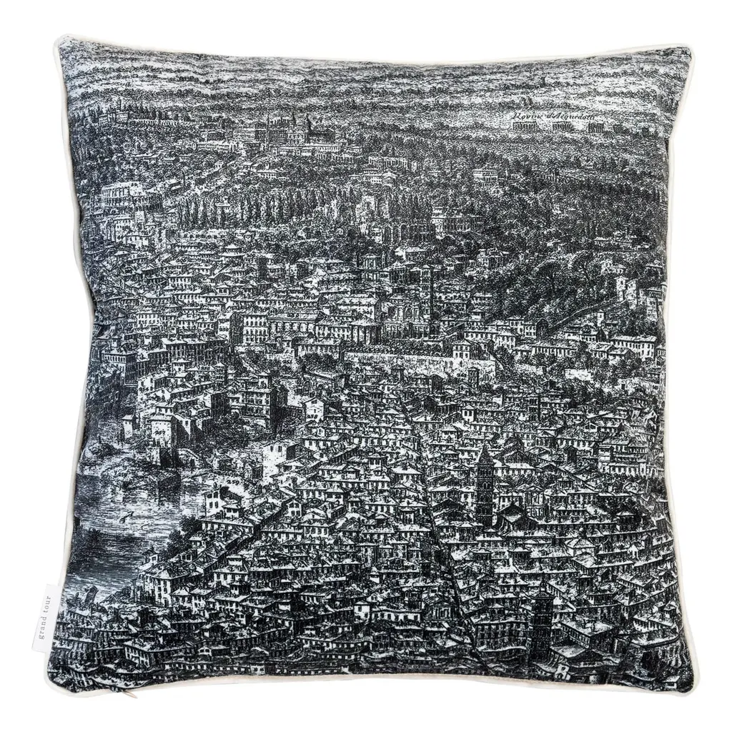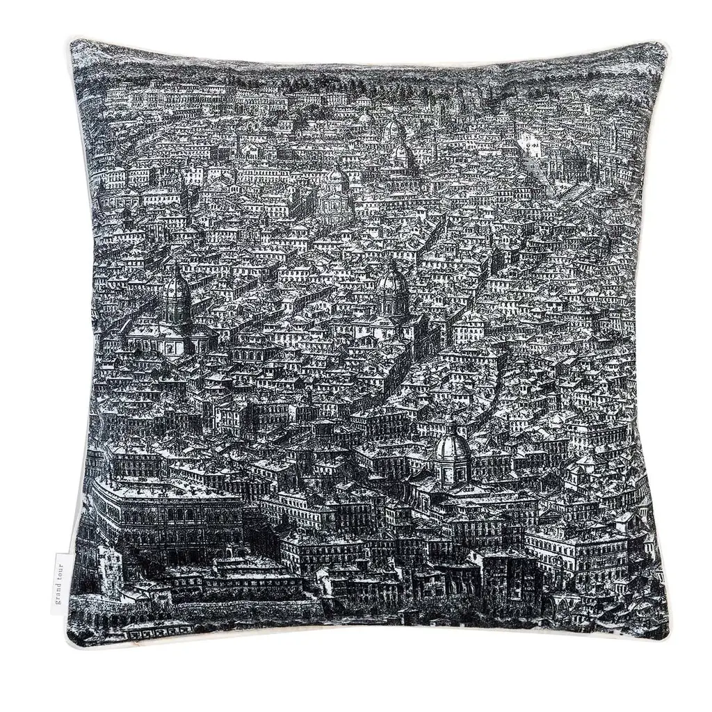 The Roma collection is a set of cushions that traces the homonymous ancient city. On one side, the houses and monuments follow one another in black and white over the entire surface, on the back the same portion of the landscape with the Roman hills and the sky explodes in the colors of the sunset.Pillow 6/6.