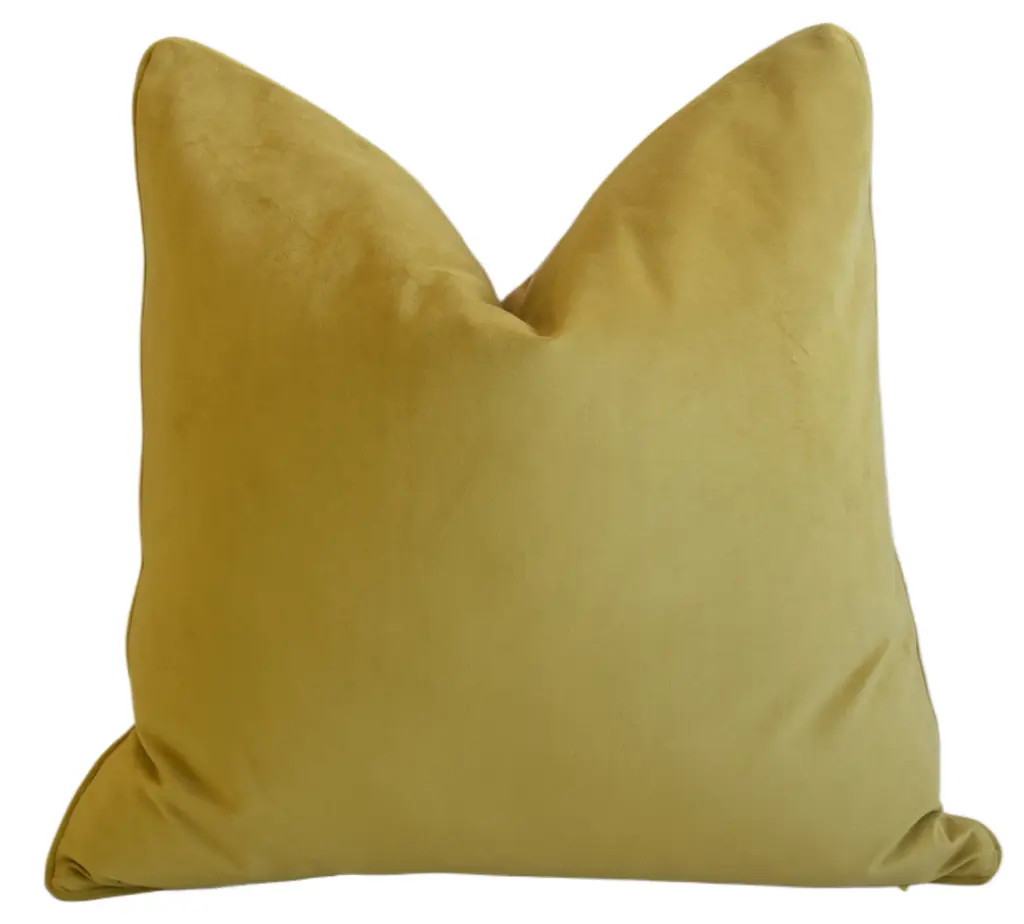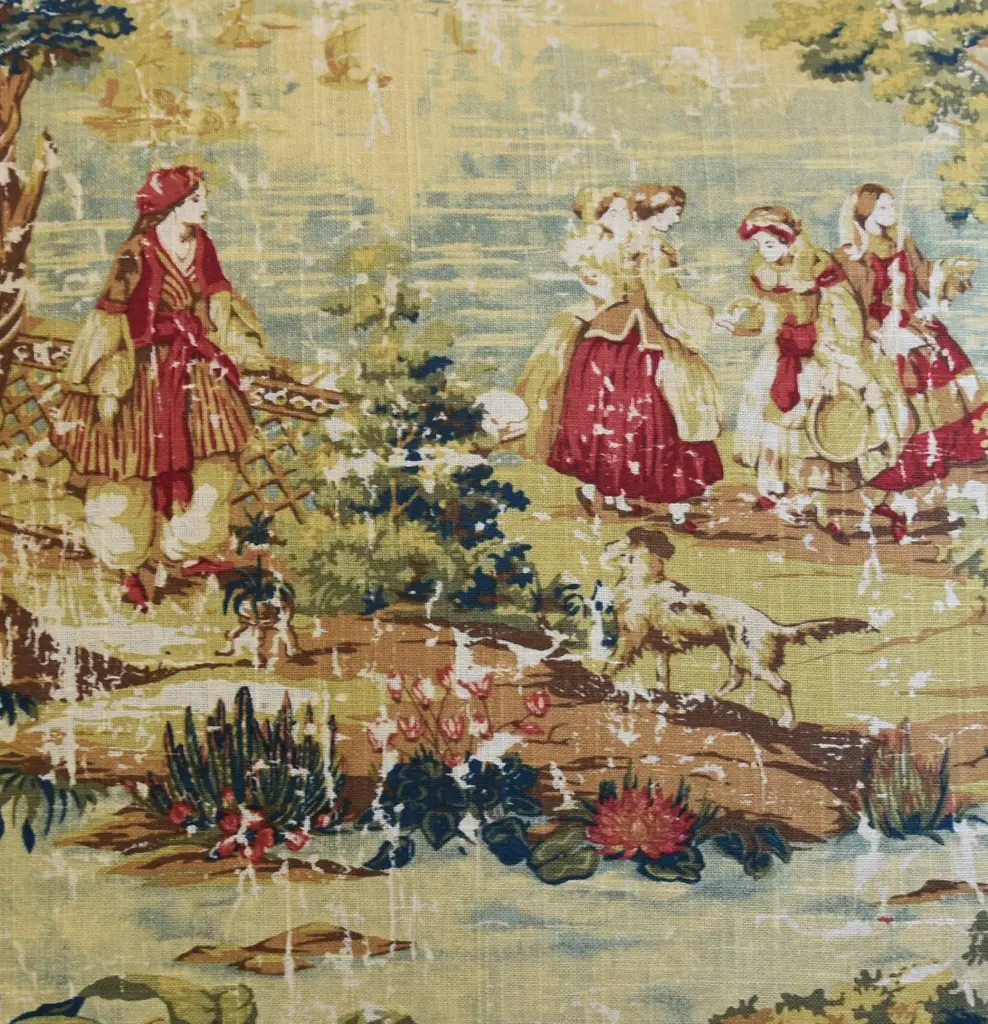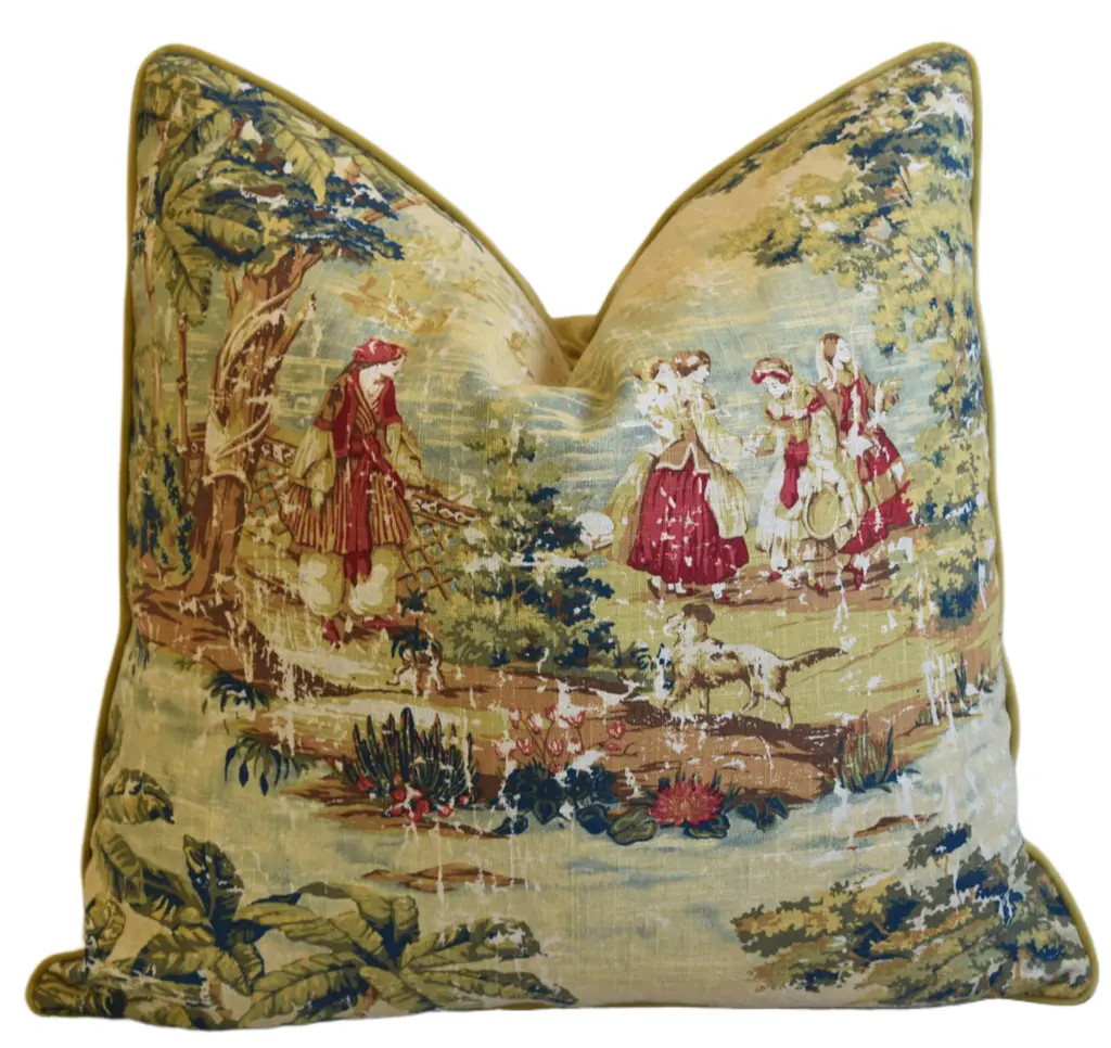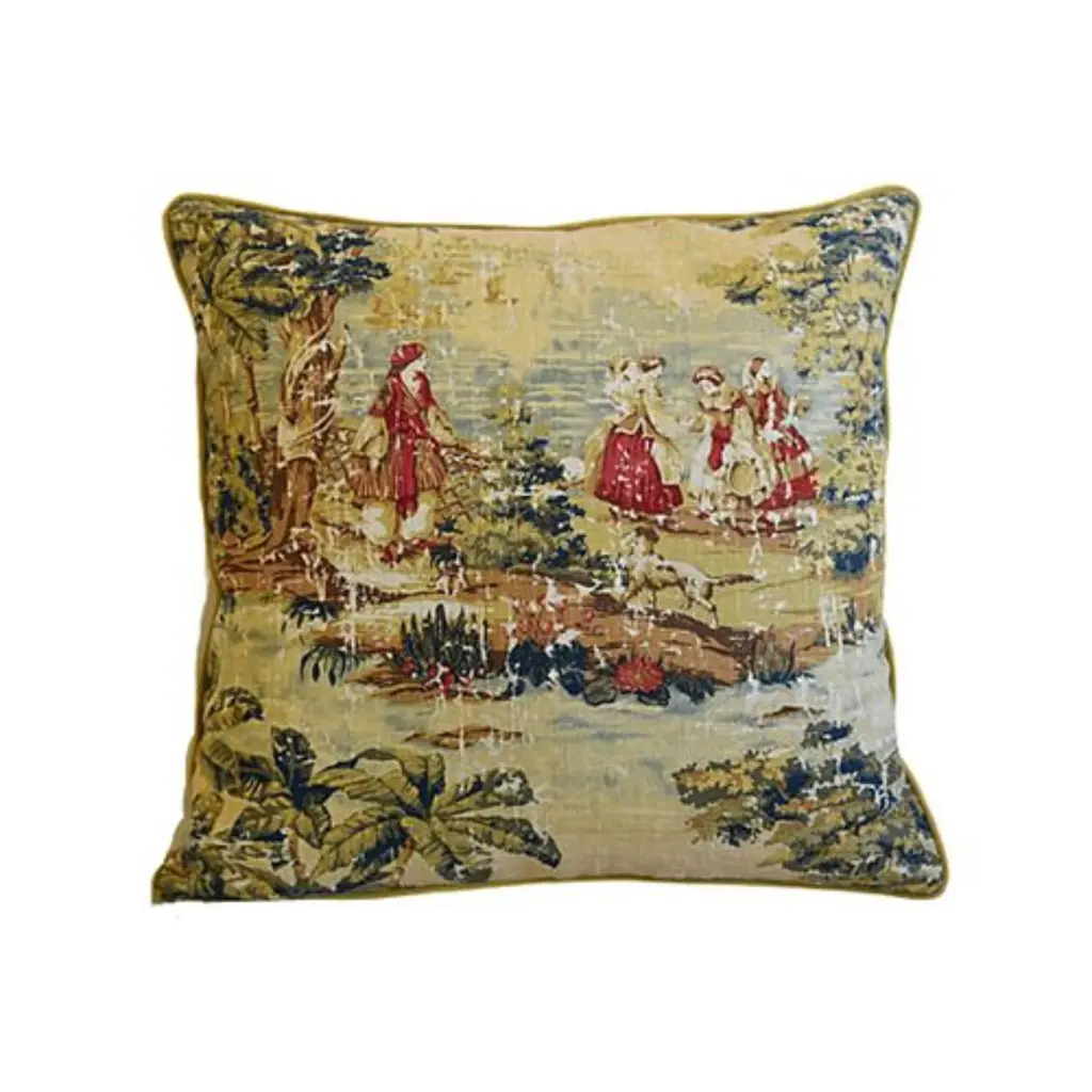 A custom-tailored pillow in printed linen fabric depicts a beautiful, romantic, French country antique toile design. Gold-colored velvet fabric back. Custom cord trim. Zipper closure. Generous goose down-and-feather insert. Excellent new, perfect unused condition.