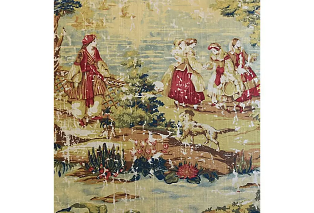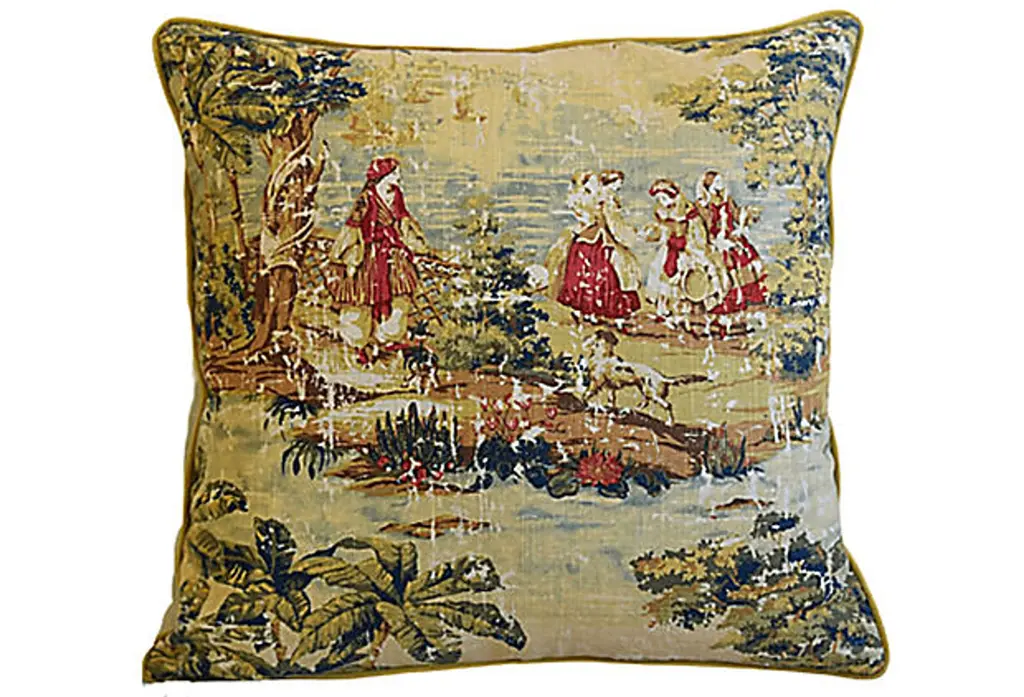 Custom-tailored pillow in printed linen fabric depicting a beautiful romantic French country antiqued toile design. Gold-colored velvet fabric back. Custom cord trim. Zipper closure. Generous goose down-and-feather insert. Excellent new unused condition.