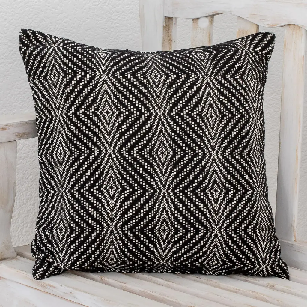 This splendid artisan cushion makes for a spot-on addition to armchairs and sofas in contemporary or eclectic decors. The hypnotizing, raised pattern of concentric black rhombuses is made up of grape-like cotton stitches resulting from the application of a manual weaving technique from Sardinia that is called "pibiones" (Sardinian word for grapes). The ecru-hued backdrop allows the pattern to stand out for stunning visual touch.