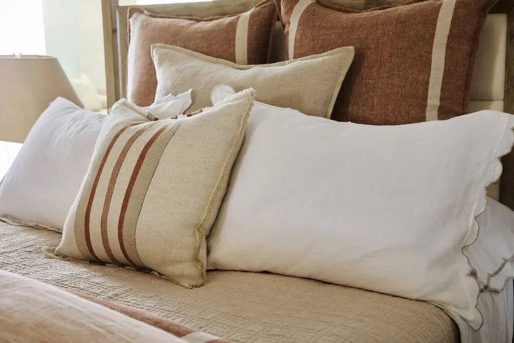 Calm and earthy, Rory Moss/Flax is a generously sized accent pillow made from 100% linen and woven in a subtle herringbone pattern that brings soft texture and depth. The soothing moss and natural flax color palette offer a sense of calm and connection to nature, while a slim cream stripe provides just the right touch of contrast. Perfectly stuffed for comfort and finished with a hidden zipper, Rory delivers a relaxed yet polished feel that's easy to layer. Pair it with other pieces in the Rory collection to create a balanced, inviting bed with an effortlessly composed look. Measures 28” X 36”, insert included. Coordinating duvet and shams available.