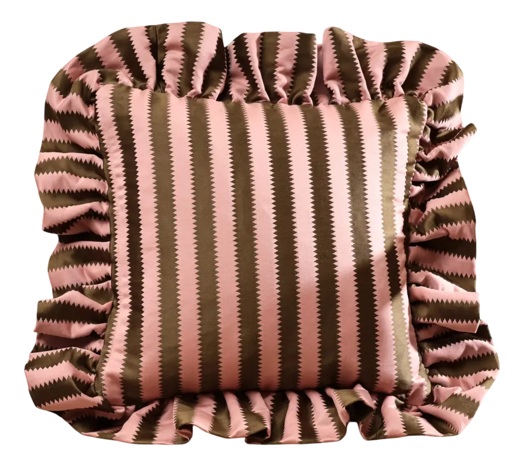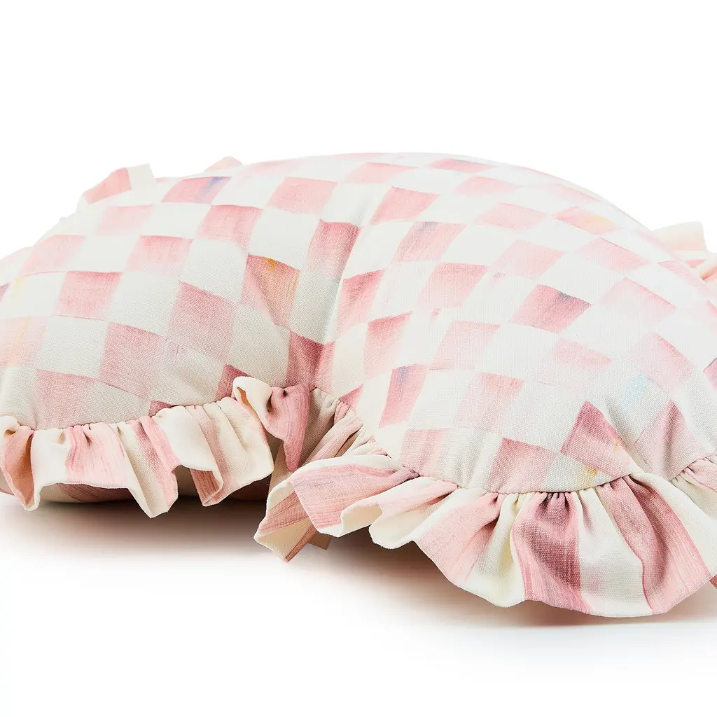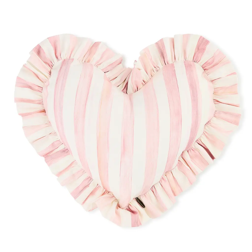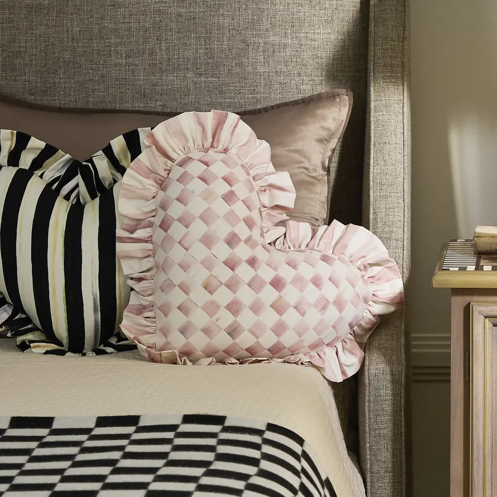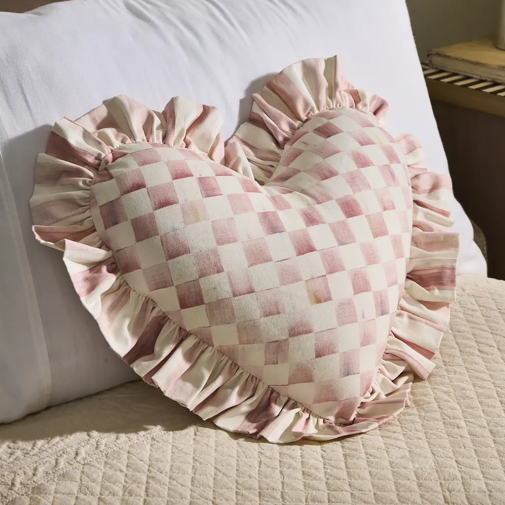 Make a statement on the sofa with this fabulous Rosy Heart Throw Pillow with Ruffle, which features our blush-hued Rosy Check and Stripe patterns. Designed in the shape of a sweet heart and finished with a playful ruffle.