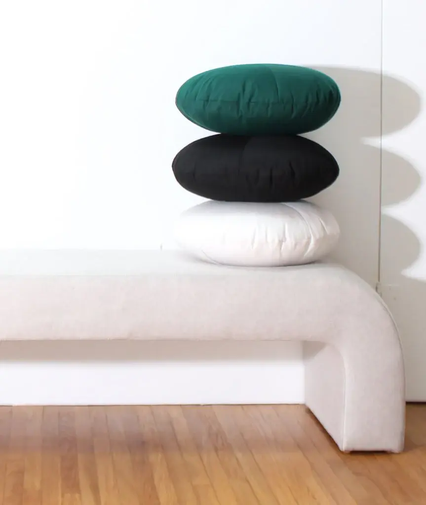 Circle pillow filled with down and hand sewn in Los Angeles using all Sunbrella fabric color options. Suitable for both indoor and outdoor use.