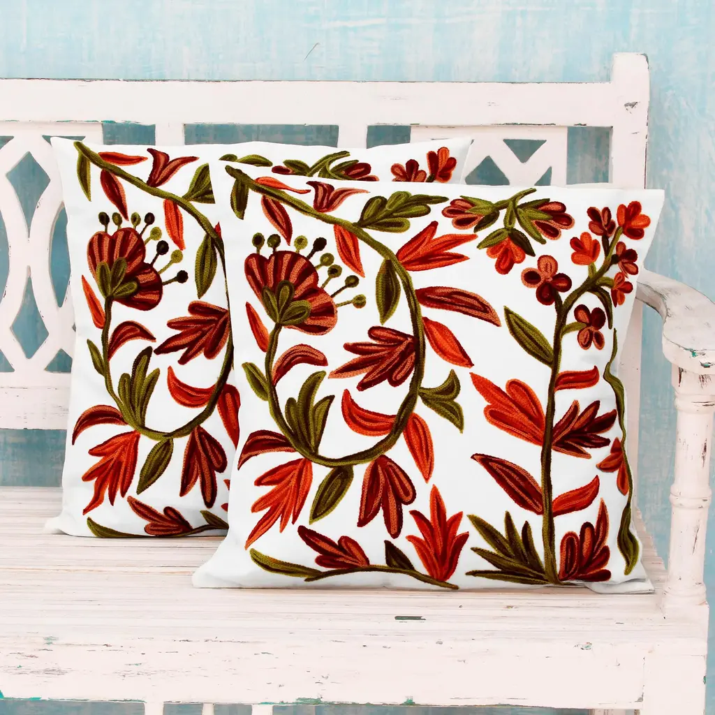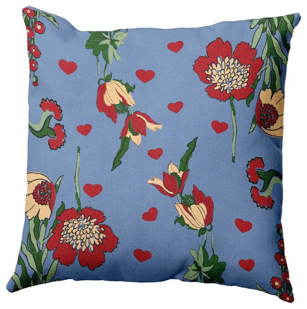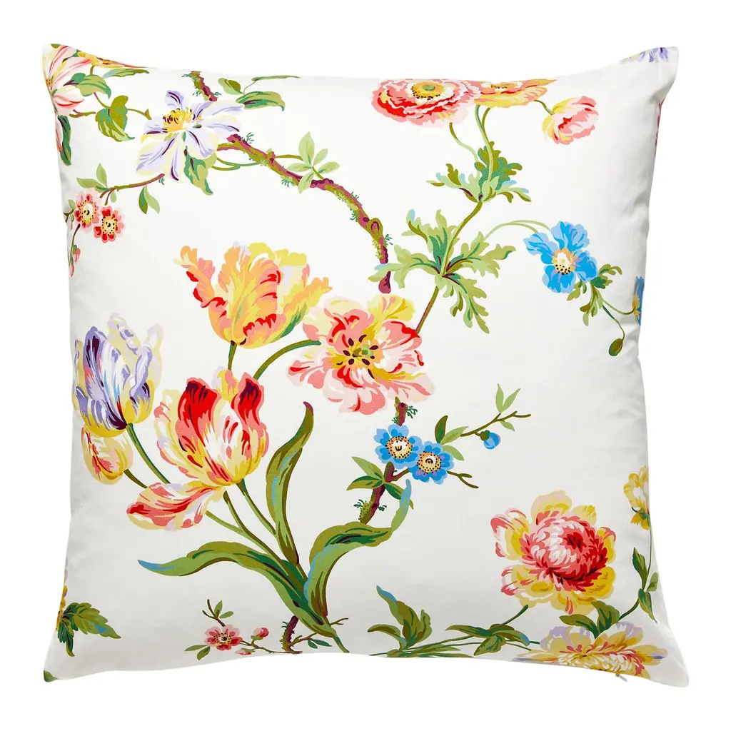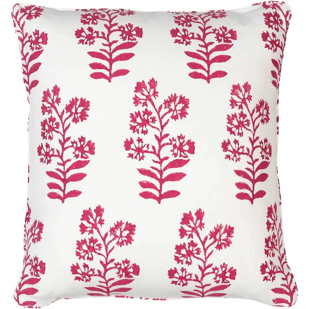 This pillow features Royal Poppy Stripe by Marie-Anne Oudejans for Schumacher with a knife edge finish. Inspired by Dutch simplicity and traditional Indian flower motifs, Jaipur, India–based decorative painter Marie-Anne Oudejans created Royal Poppy Stripe in red as a charming, versatile fabric design that combines stylized flowers and multi-width stripes. Pillow includes a feather/down fill insert and hidden zipper closure