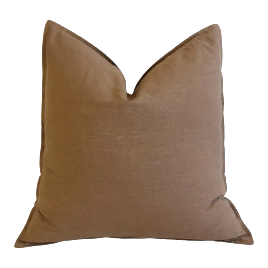 Beautiful French brown velvet pillow with binded edge. Metal zipper closure, and leather pull. Custom made in Paris, France. Includes Insert. Size: 20" x 20".