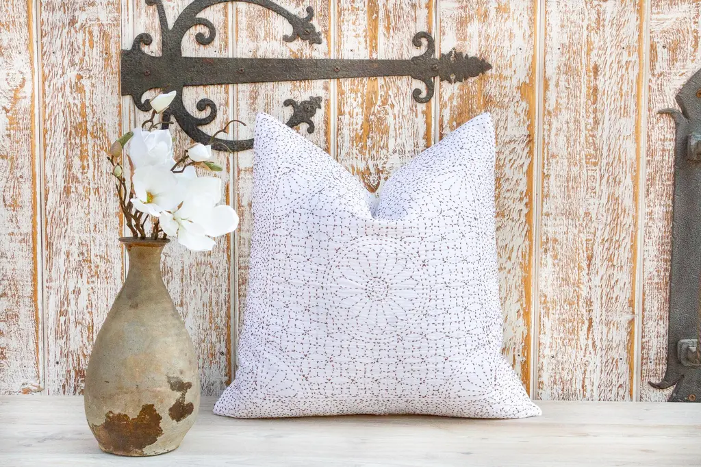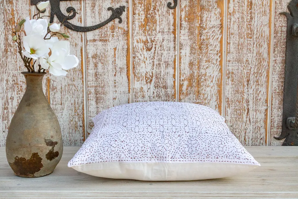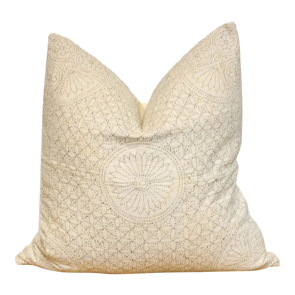 Celebrate the feminine with the handmade Filanan Gudari Pillow. This ornate pillow is cotton based and adorned with the Meghval tribe's thread work. The embroidered medallions in this incredibly soft piece of art represent the circle of life. **Please bear in mind that colors of products shown may vary slightly from their original color due to monitor display settings or photography studio lighting.