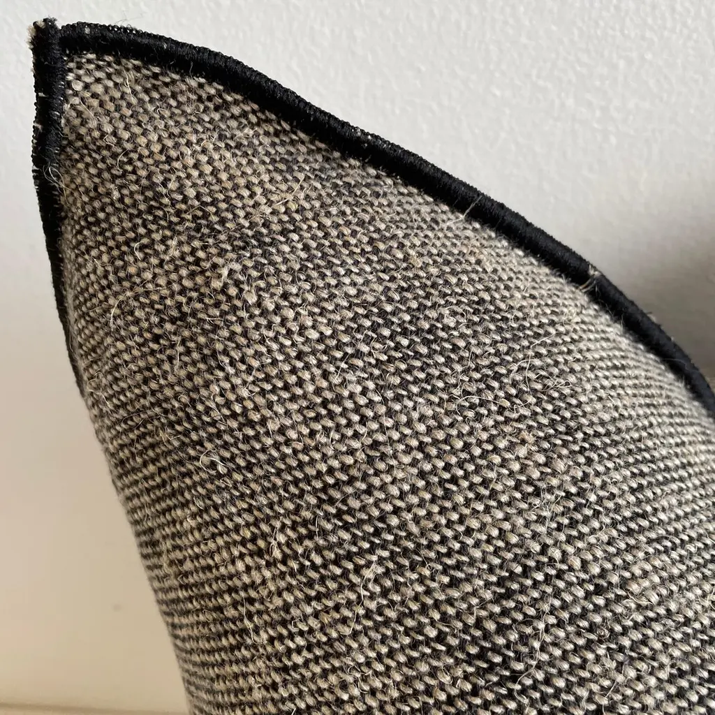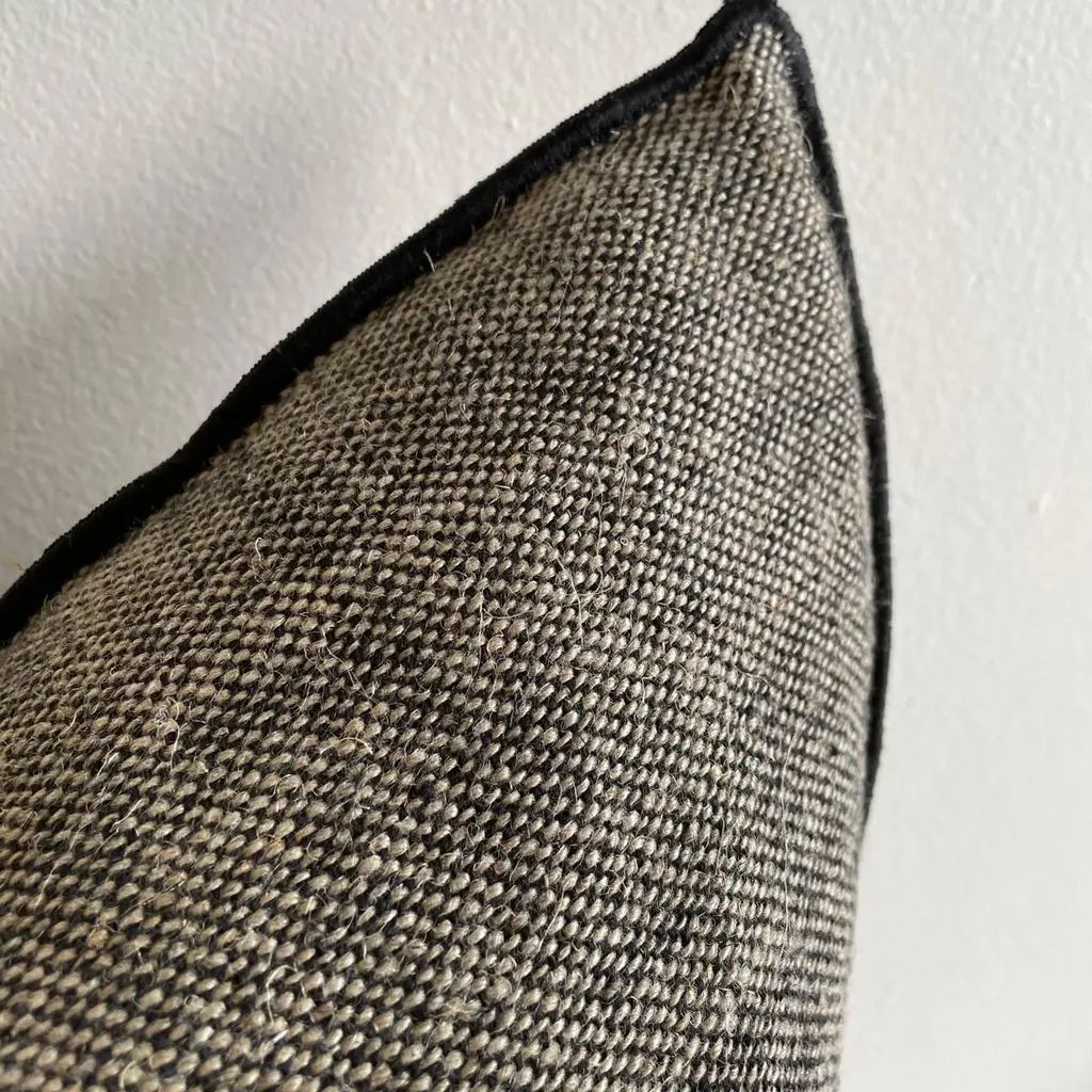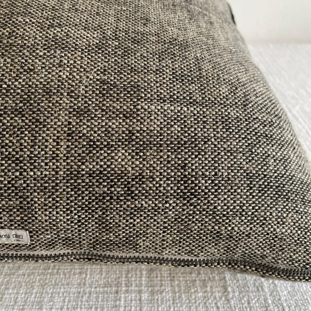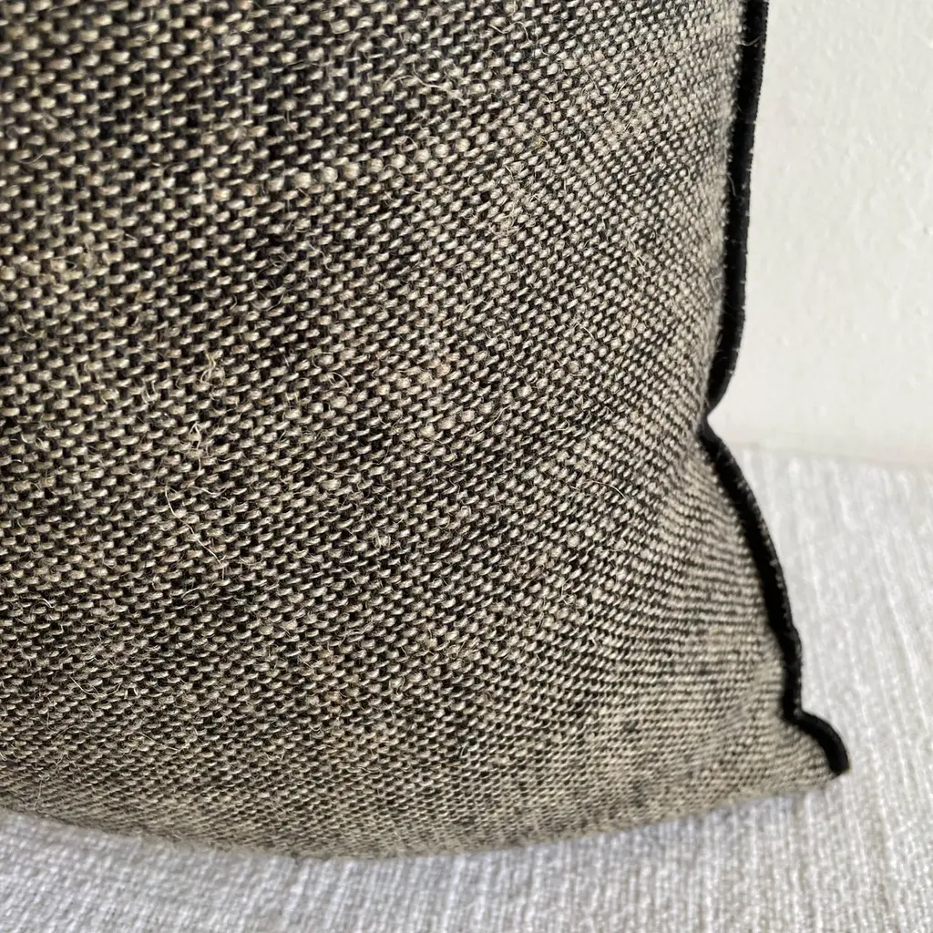 Custom linen blend accent pillow. Color: Noir A grey/ black colored nubby textured style pillow with a stitched edge, metal zipper closure. Our pillows are constructed with vintage one of a kind textiles from around the globe. Carefully constructed with the finest textiles, with hidden zipper closure, and overlocked seams. Includes a down feather insert. Limited quantities available. Measures: 20" x 20".