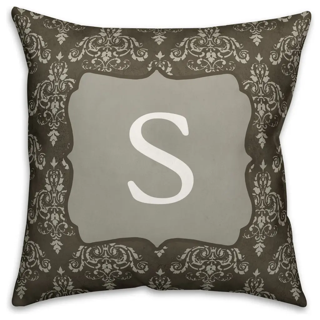 S Dark Gray Damask Monogram Spun Poly Pillow, 18x18