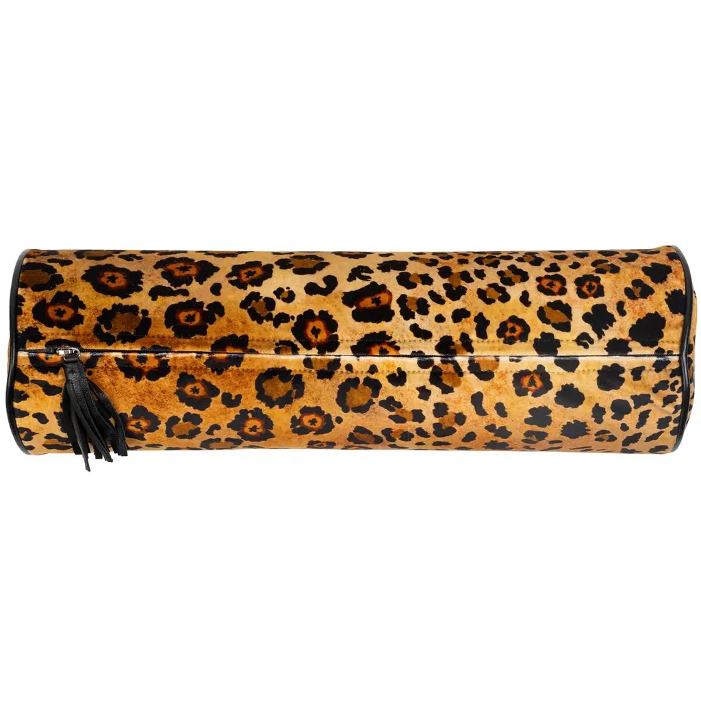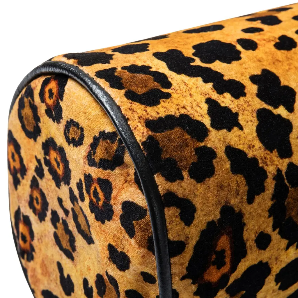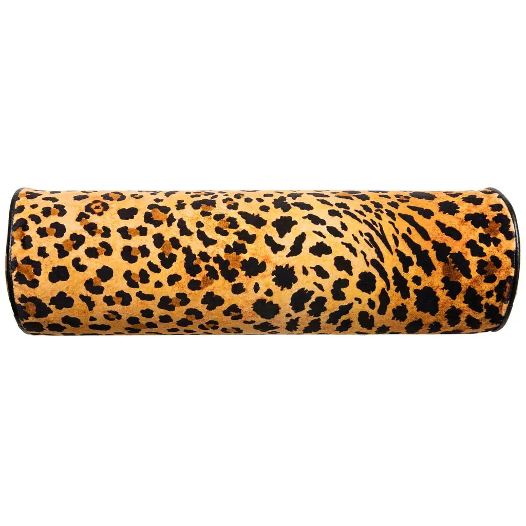 The velvet fabric and leather welting lend a luxurious look and feel to this animal-print bolster pillow.