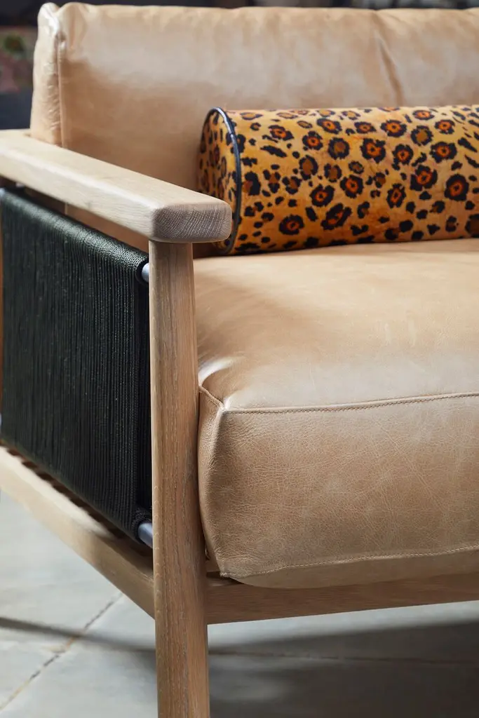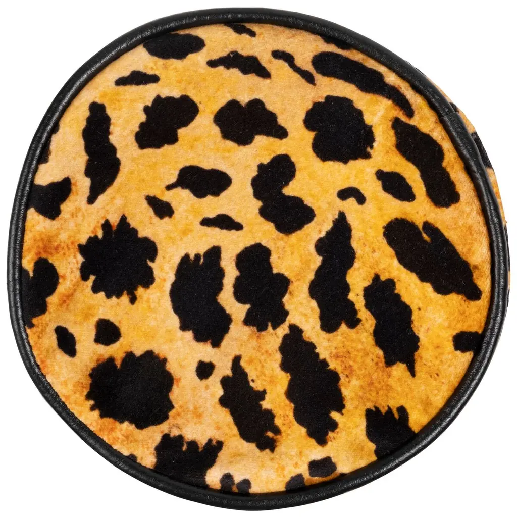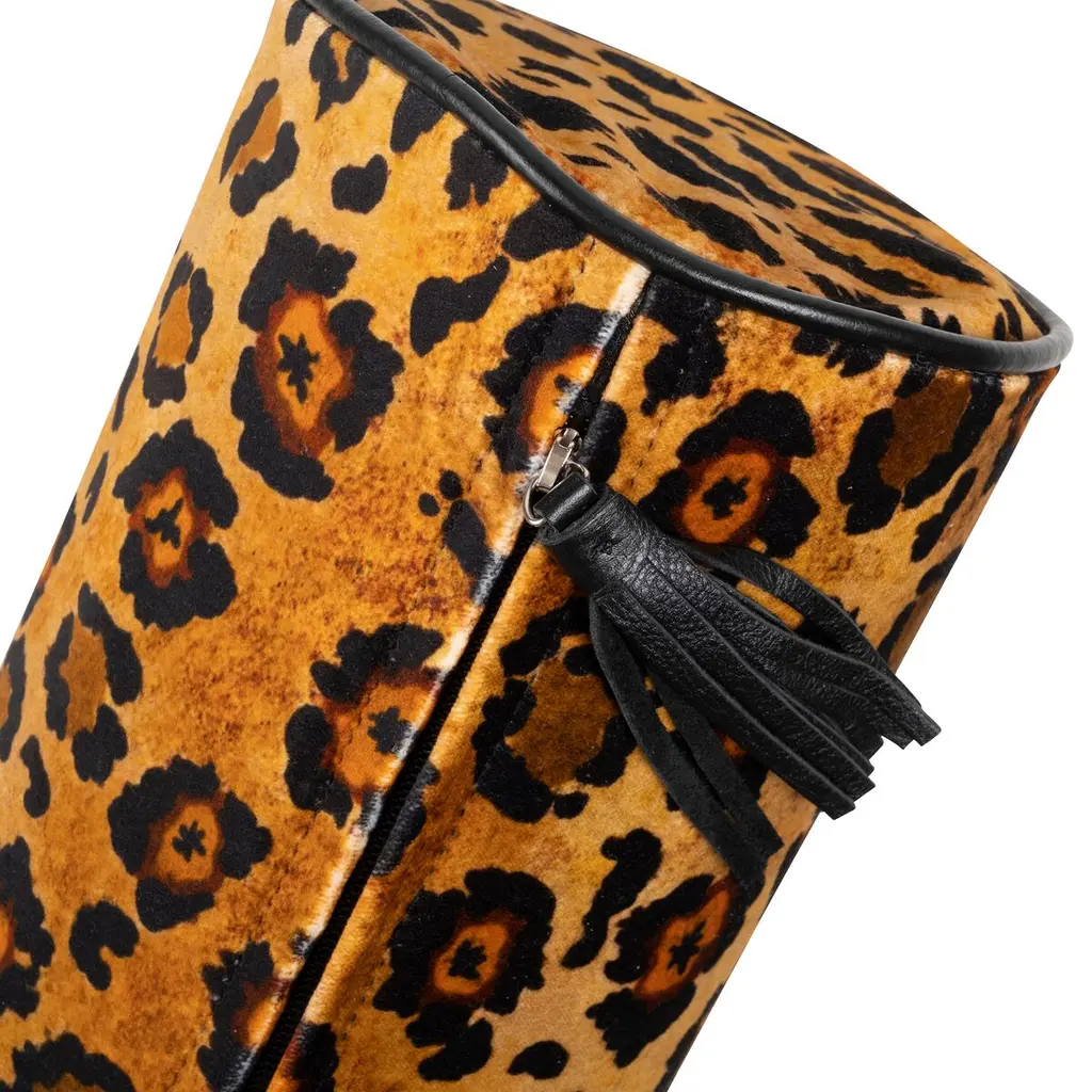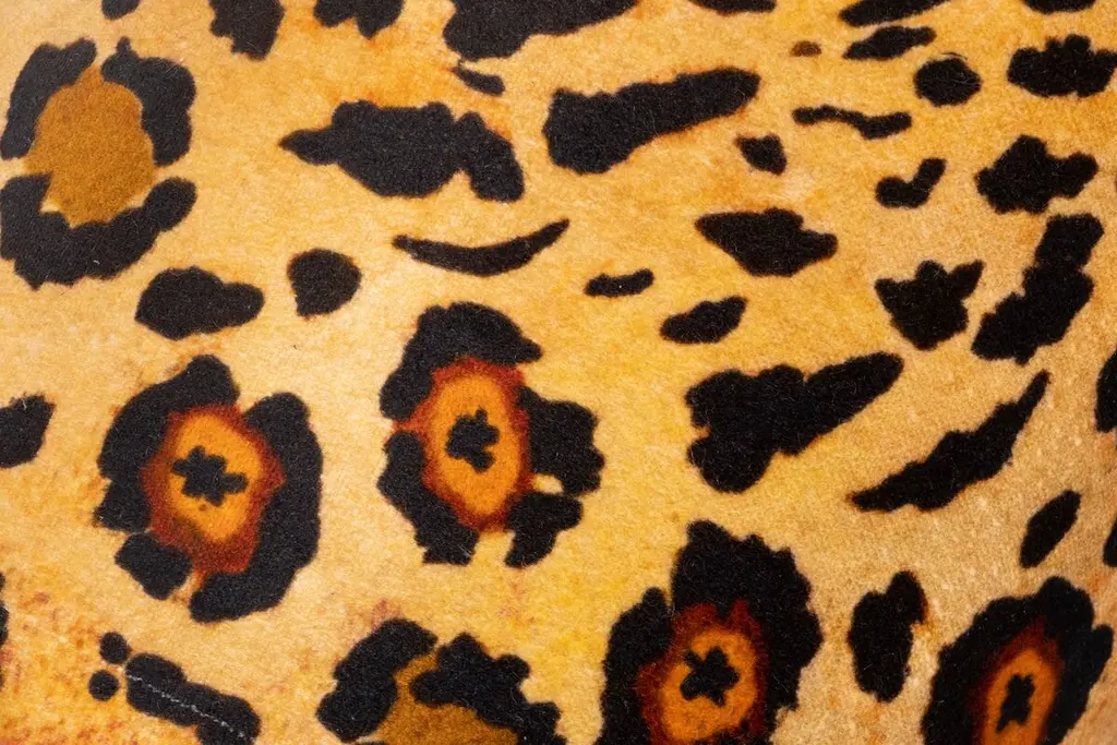 The velvet fabric and leather welting lend a luxurious look and feel to this animal-print bolster pillow.