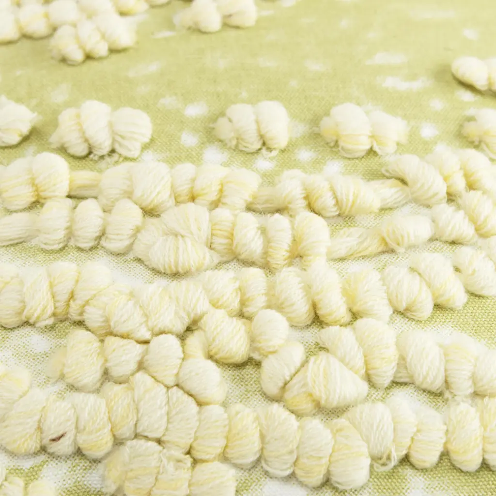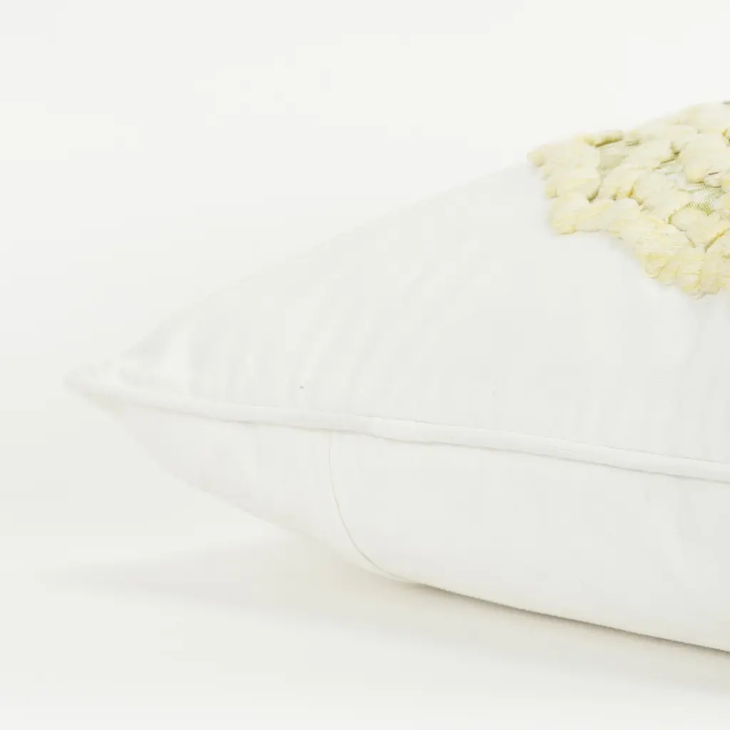 This printed pillow features heavy hand applied cotton yarning accents to create a soft texture and a remarkable dimension to this festive harvest pillow. This pillow will be at home in transitional artistic living spaces. The handcrafted artisanal appeal of this pillow makes it a wonderful fit in a young vibrant busy living space. The soothing nature of its palette makes it a sophisticated addition to the living space of a more minimalistic environment. This pillow features a self-welt which frames the pillow. The back is of the same solid cotton and features a hidden zippered closure for ease of fill.