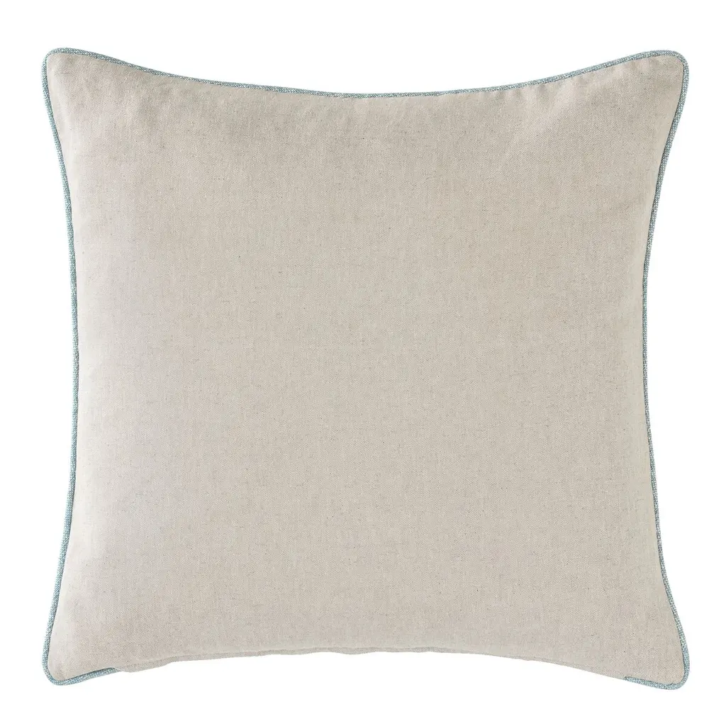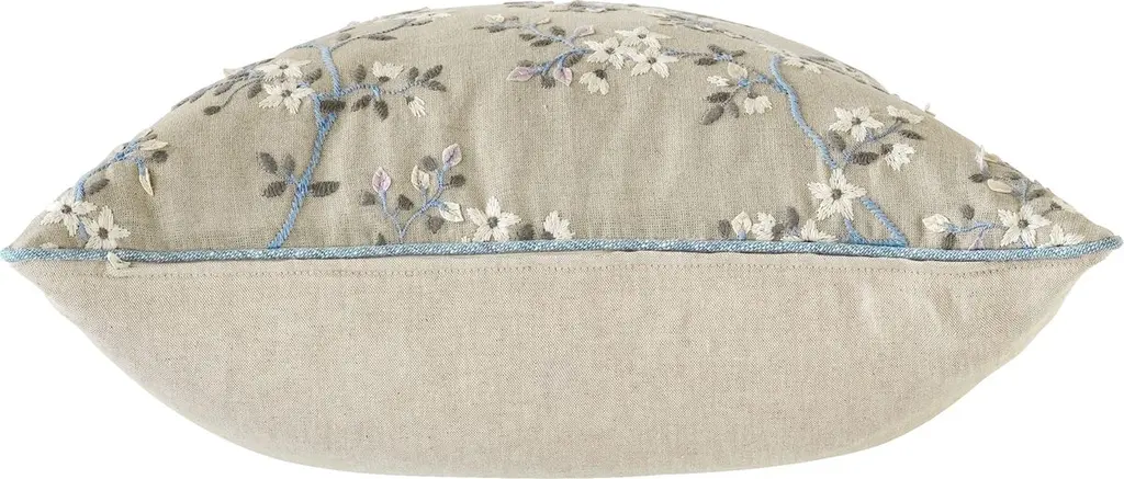 Graceful flowers are embroidered on the front of this linen-blend throw pillow; the reverse is a solid neutral hue. Blue welt adds to the refinement. Made in the USA, the pillow is generously filled with plume feathers for luxe loftiness. Zipper closure.