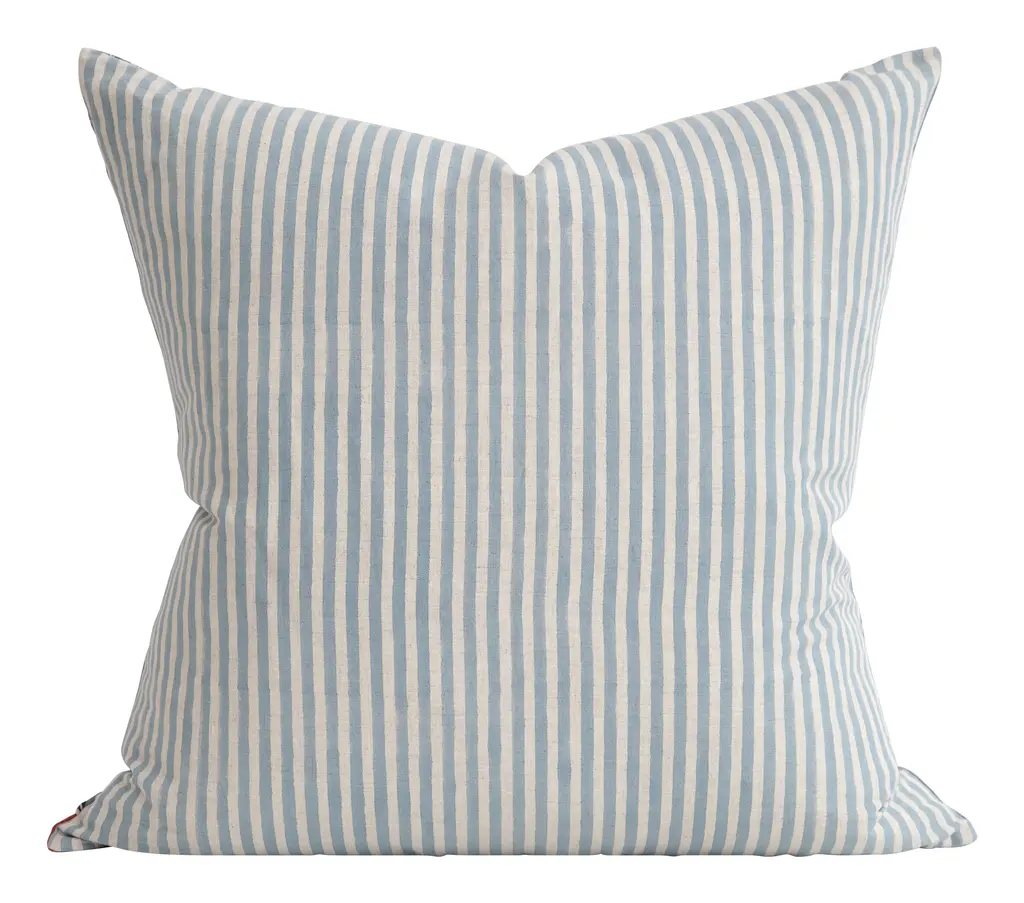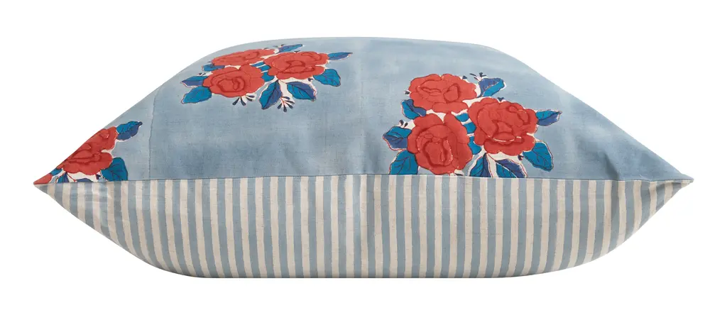 Our Sameera Pillow is the picture of homespun beauty. Following in India’s rich textile heritage, this effortlessly chic layer comes to us from a small rural village near the city of Jaipur, where it was handcrafted from start to finish by a small cooperative of skilled local artisans. This work helps these craft communities to preserve their culture’s time-honored practices while also earning a livable wage to support themselves and their families. The process starts with linen thread, which is handwoven on a traditional loom to create a soft fabric. This fabric is then expertly block-printed by hand, creating a red and blue floral motif on one side and a simple blue-and-white striped pattern on the reverse. Finally, it’s finished off with a hidden zipper closure and a luxe down and feather pillow insert for a plush feel. A lovely addition to any sofa, chair or bed, we love Sameera on its own or styled with other global-inspired prints for a well-traveled, collected aesthetic. •linen•hand block-printed patterns•hidden zipper closure•down and feather insert•fair trade •each is unique•handmade in india Dimensions •22" x 22"