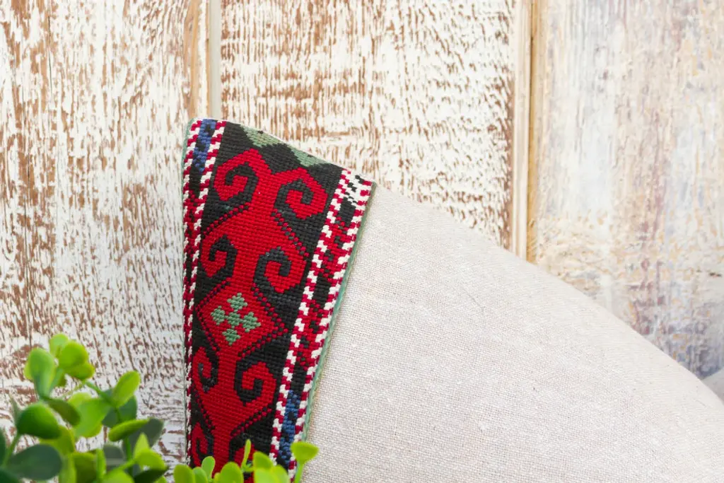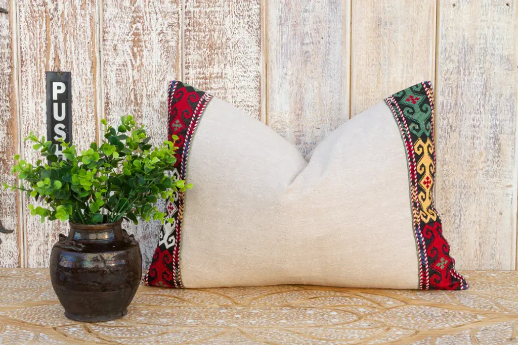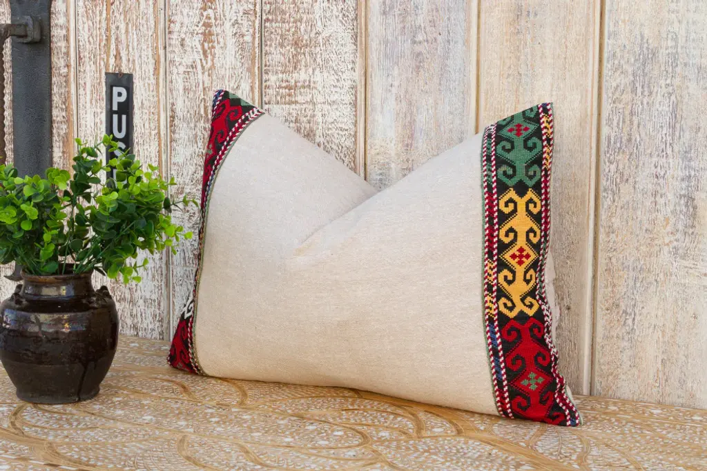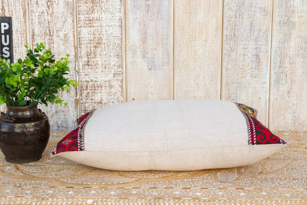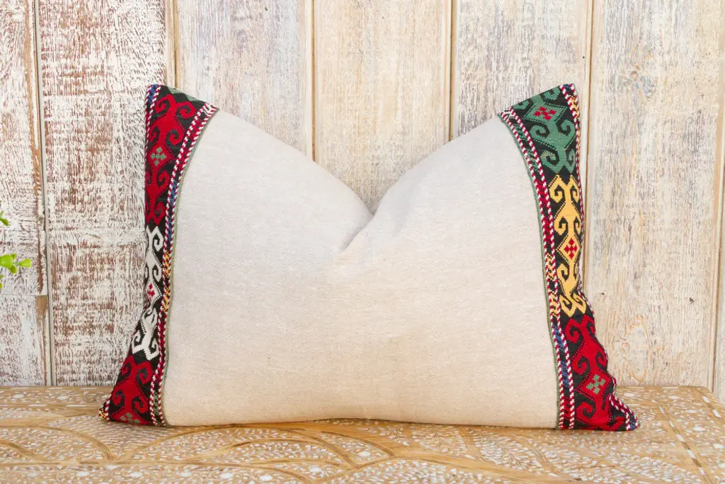 This linen pillow is flanked by rare antique tribal borders, it is bordered by hand-woven, ply-split camel girth lace and backed with solid linen with wooden button closures.