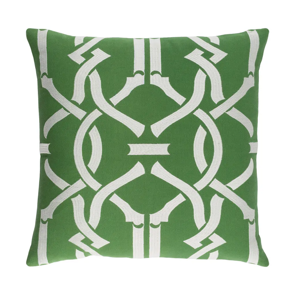 This pillow features Santorini Print Indoor/Outdoor by Trina Turk with a knife edge finish. An exuberant pattern of interlocking curves, Santorini has a bold flair. The graphic geometric is printed on acrylic making it a durable option for both indoor and outdoor use.Pillow includes a polyfill insert and hidden zipper closure.