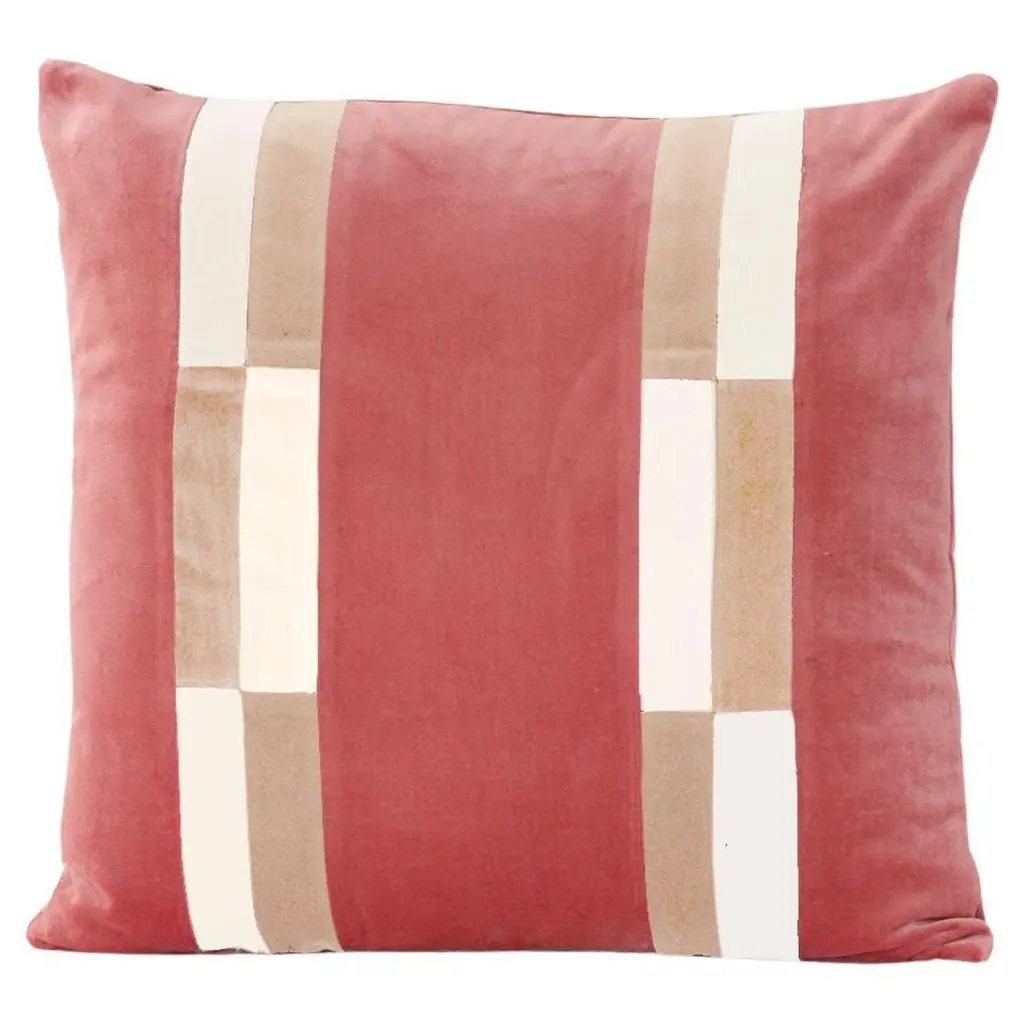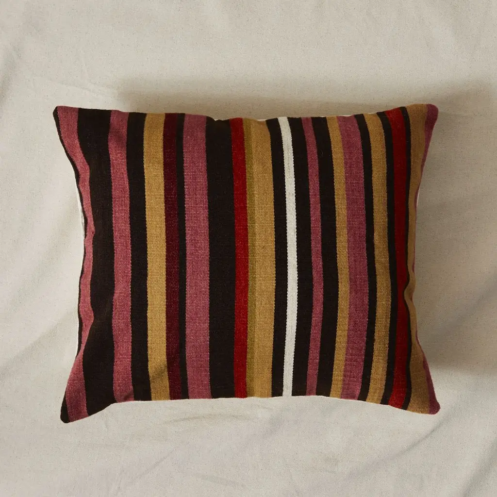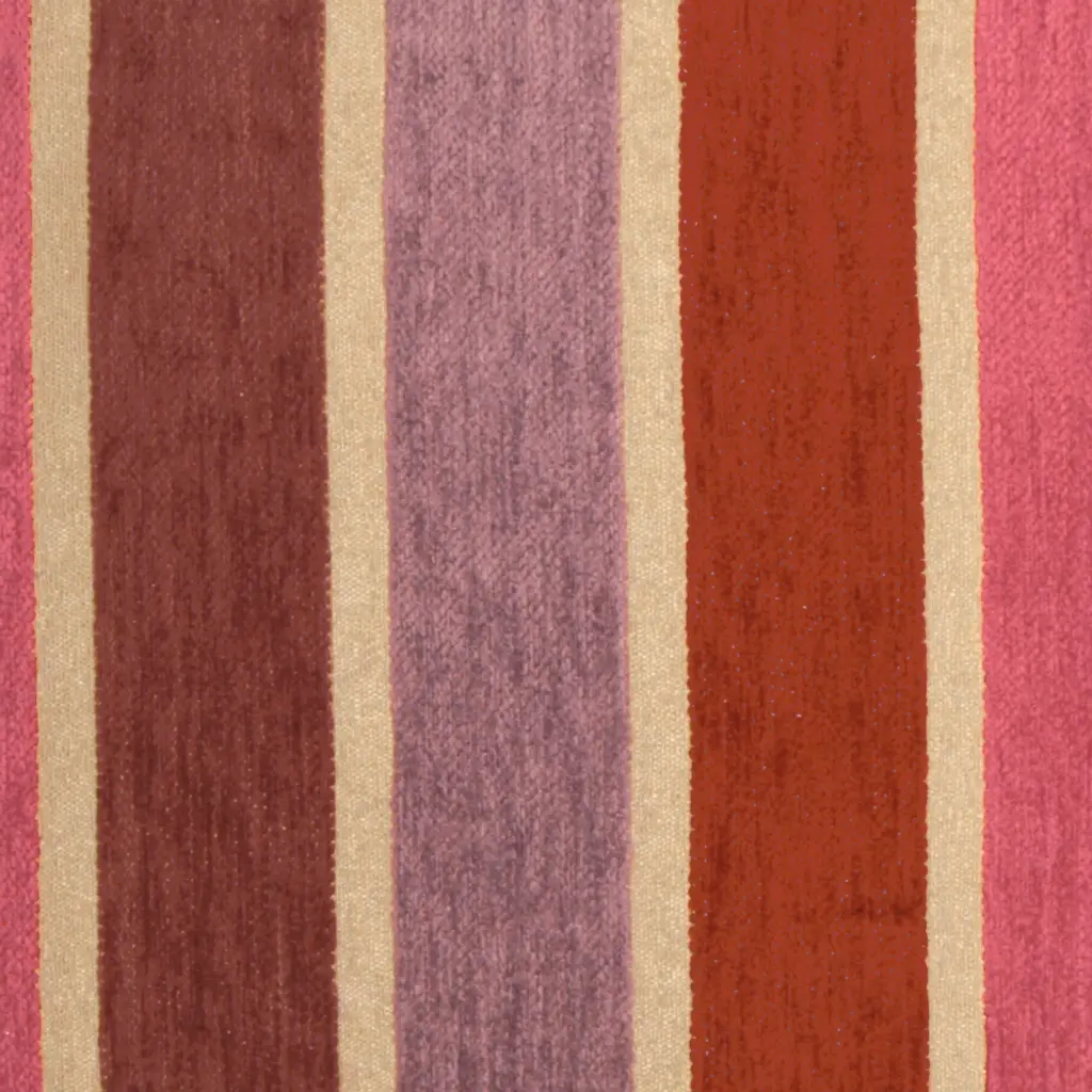 This 20"x20" square pillow features soft chenille stripes in red, wine, purple and pink, woven into a sturdy upholstery grade fabric backing. A sure way to add warmth and charm to your home. Size: 20"x20" Square Fabric: 50% Polyester / 50% Acrylic Same fabric front and back Knife edge seams Color matched, hidden zipper Dry clean recommended Made in Canada: Designed and made in Pillow Decor's Vancouver workroom.