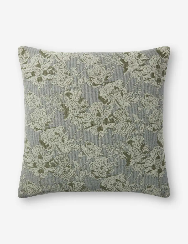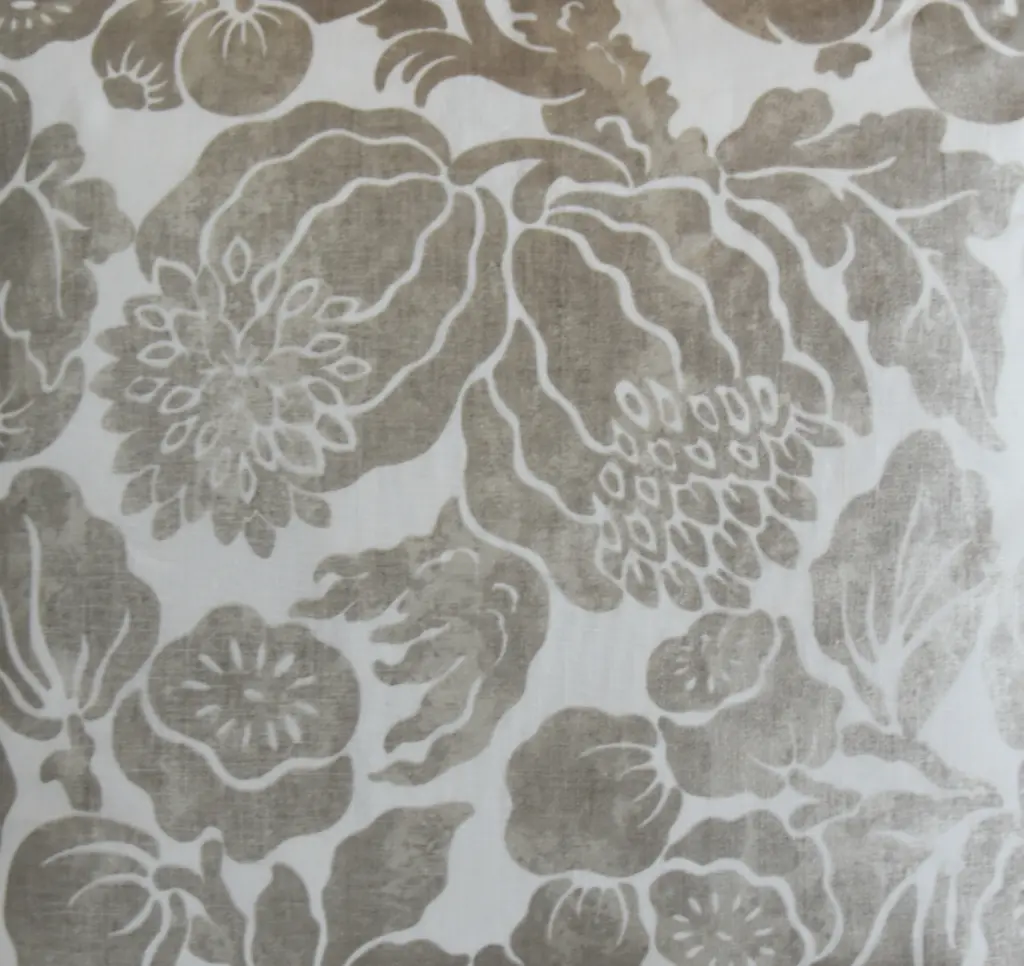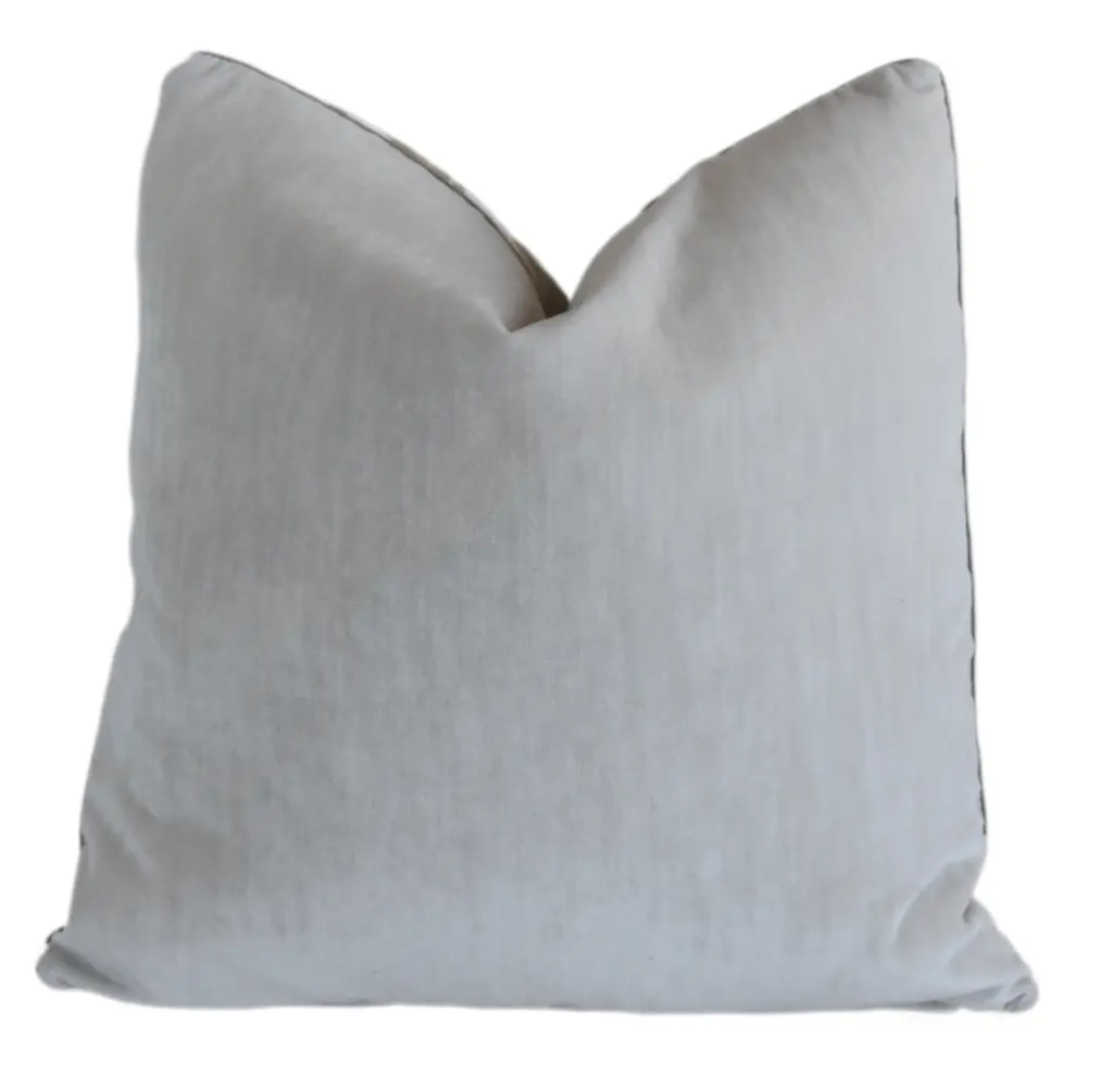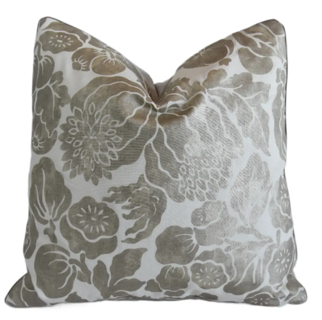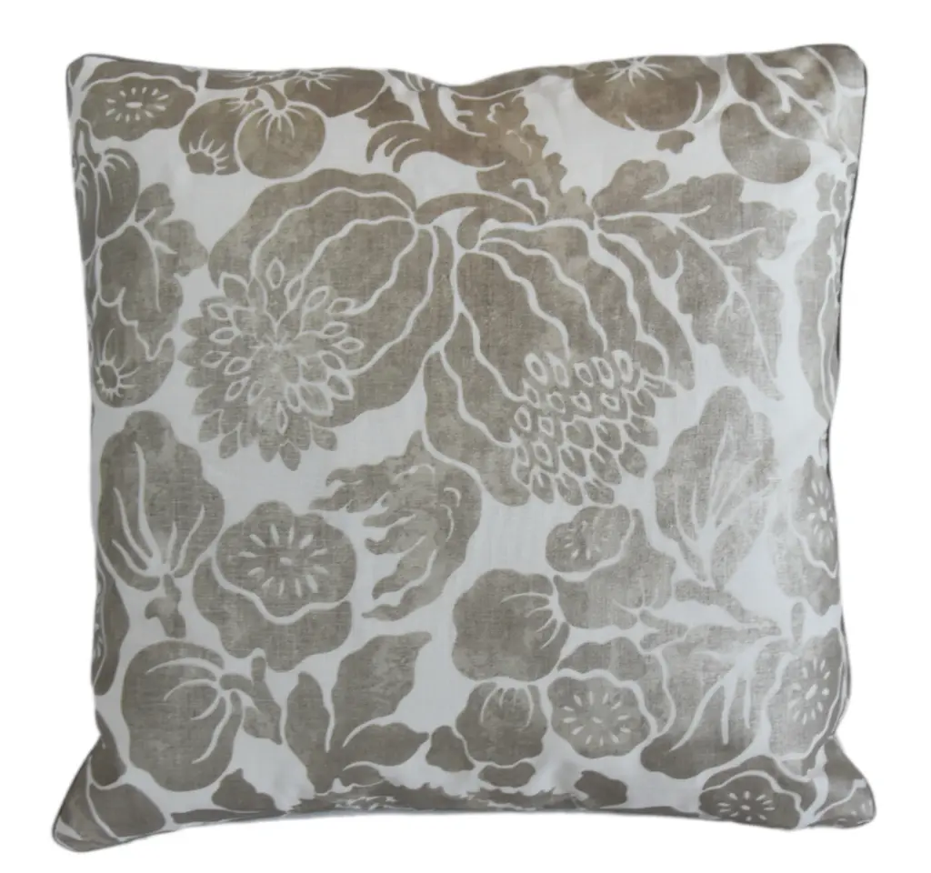 Custom-tailored designer pillow by Mike Seratt of The Prized Pig in designer Italian Scalamandre linen floral fabric called "Elsa” depicts a stunning botanical floral design. Complementary linen-velvet fabric is on the reverse. Custom trim. Zipper closure. Generous plump goose feather-and-down insert. Pattern placement may vary according to the fabric cut. Excellent new, unused, beautiful condition!!!!