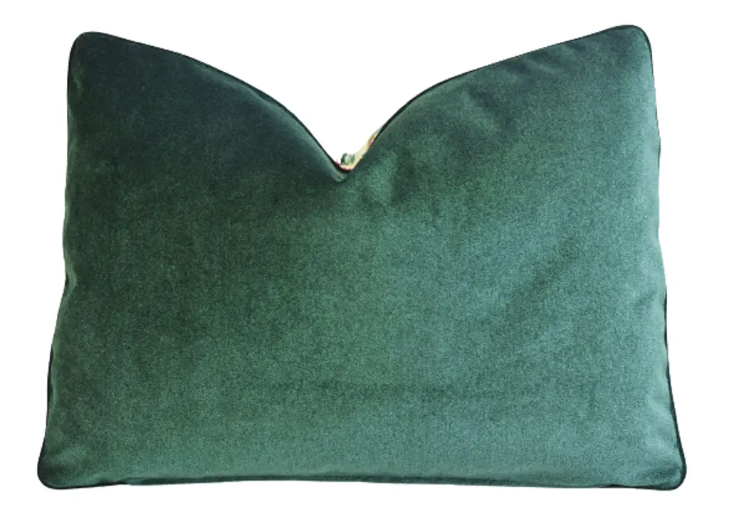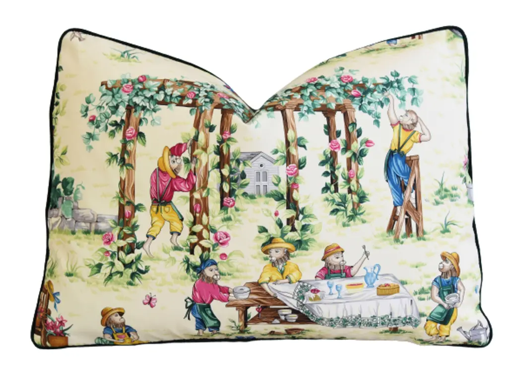 Pair of custom-tailored designer pillows in Fonthill Ltd./Scalamandre "Giardinieri" hand-printed cotton from Italy with a fun and charming garden, bears, and floral design. Emerald green cotton-velvet fabric backs. Custom cord trim. Zipper closures. New goose down-and-feather inserts. Excellent new, unused condition!!