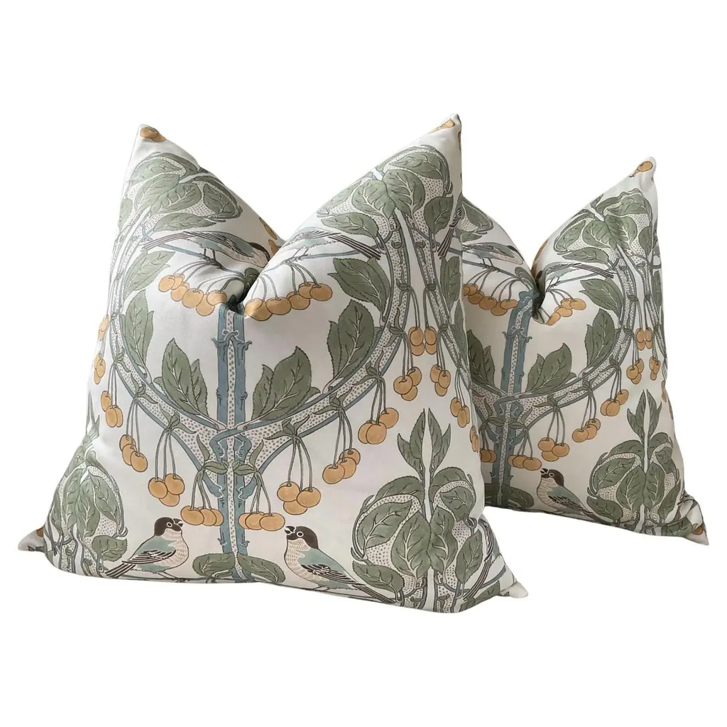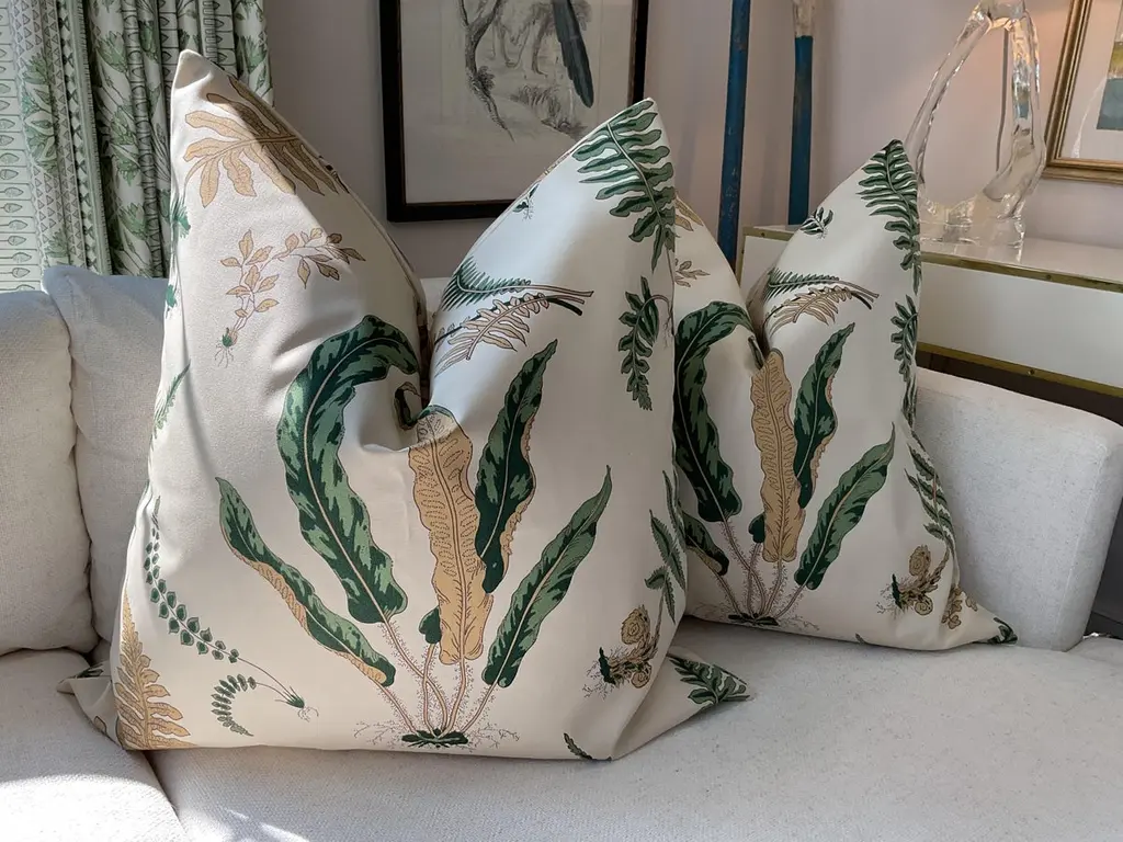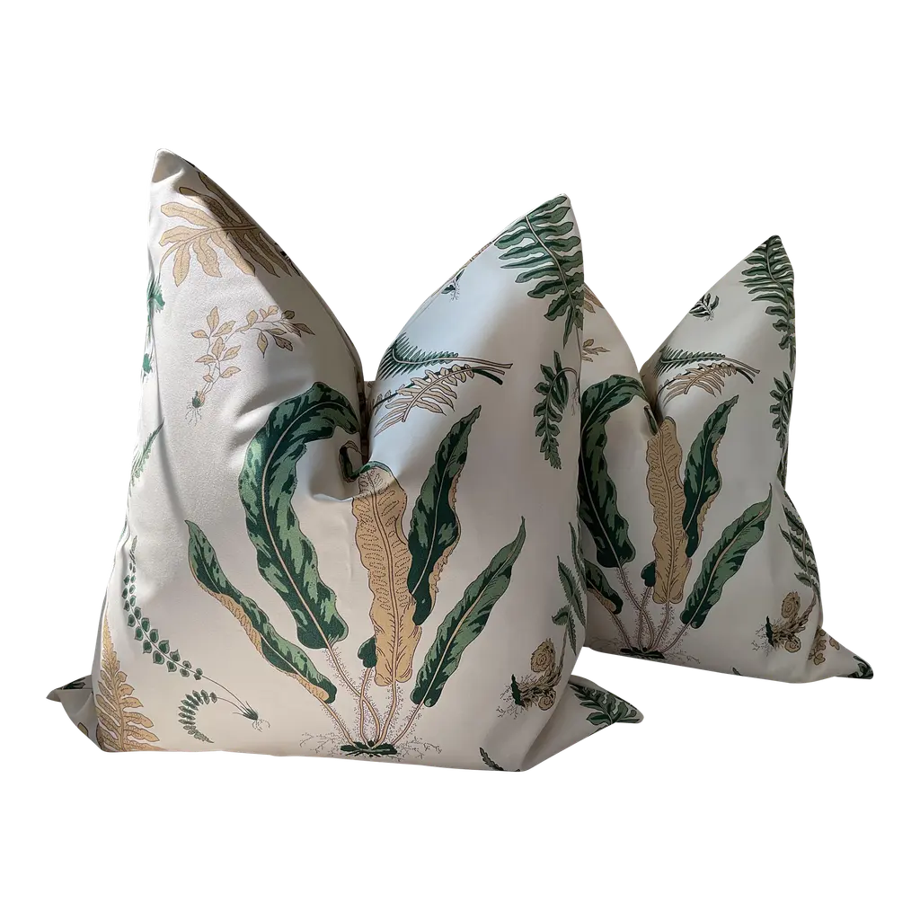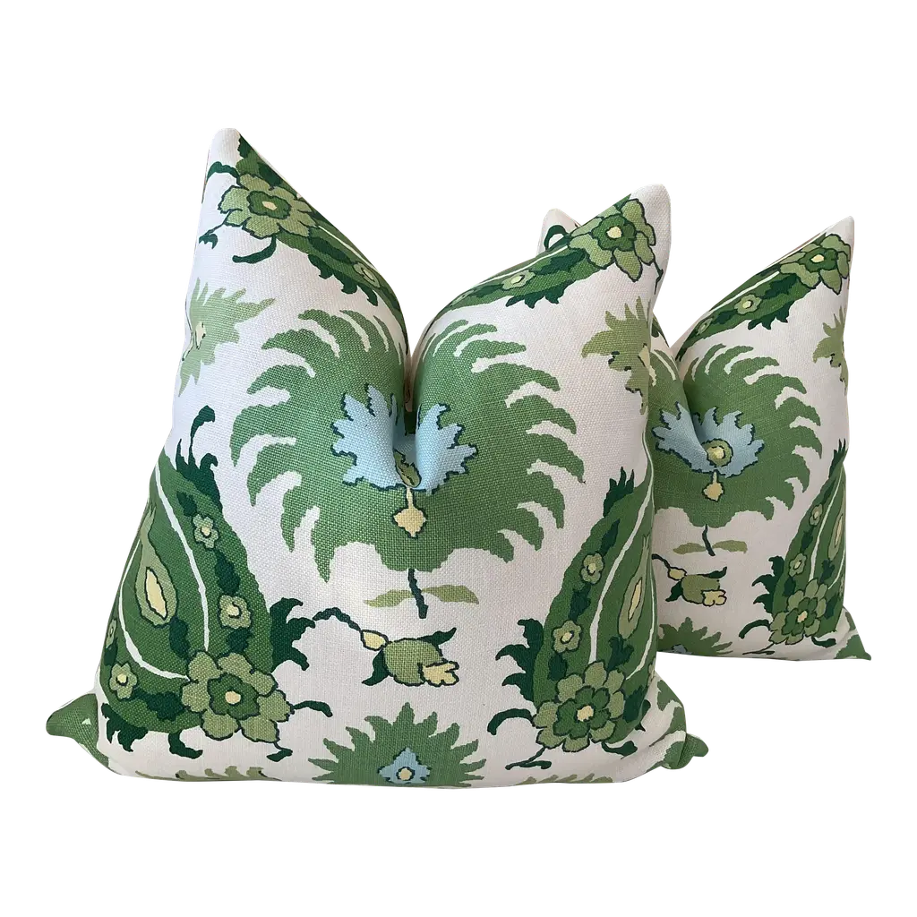 I love these indoor/ outdoor covers! This listing is for the off-white and green colorway. Scalamandre's Elsie de Wolfe fabric is an exquisite blend of elegance and whimsy. This luxurious textile features a charming pattern inspired by the iconic interior designer's style, combining delicate motifs with a sophisticated color palette. The fabric's refined quality and timeless appeal make it a perfect choice for discerning decorators seeking to add a touch of classic glamour to any space.These will come as a 22": pair with plush-down inserts. Closure is by way of an invisible zipper.About UsAt Accent Marks, each designer pillow is crafted with care using the finest hand-selected fabrics and trims, paired with durable, discreet invisible zippers. We specialize in creating beautiful, high-quality pieces that elevate your home decor. While most of our listings feature 22" pillow pairs, we also offer a range of sizes and single pillow options to suit your needs. All of our Accent Marks pillows are proudly made in the United States.If you don't see the fabric you're searching for, please reach out via message as we have other fabrics available upon request and can create anything that you like. Thank you for visiting Accent Marks!