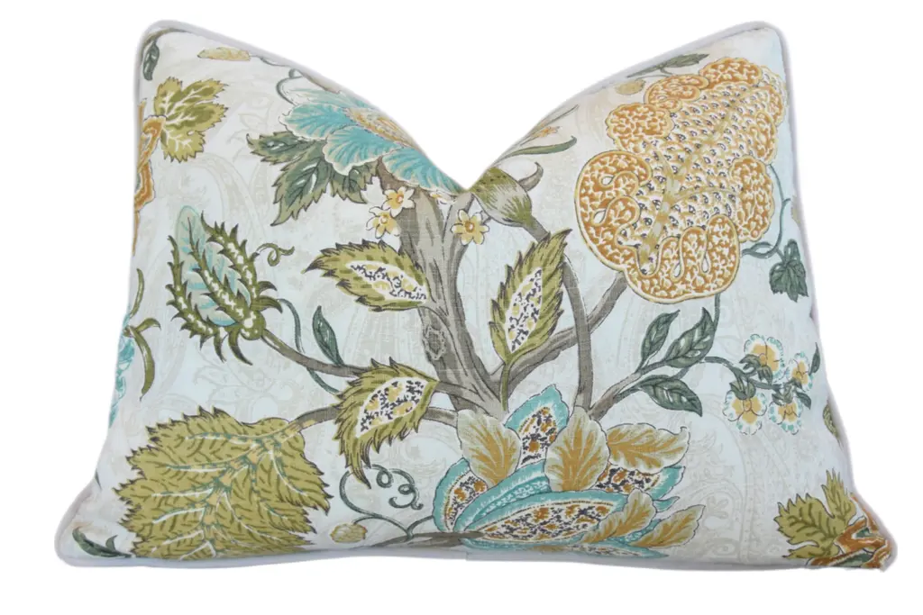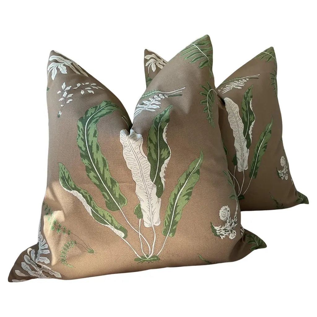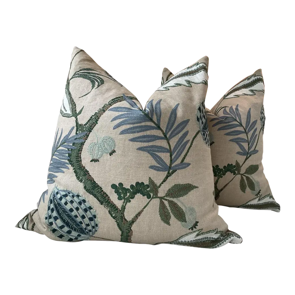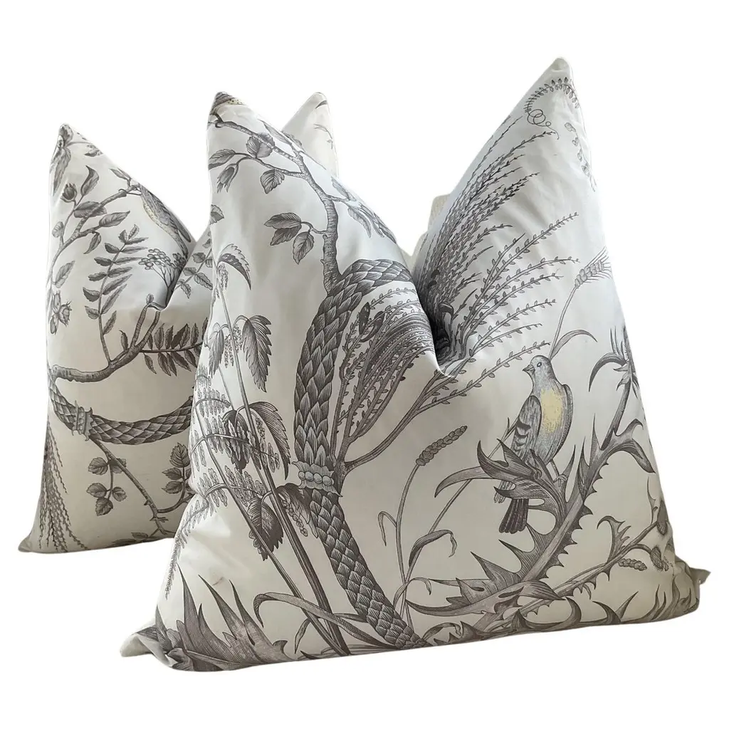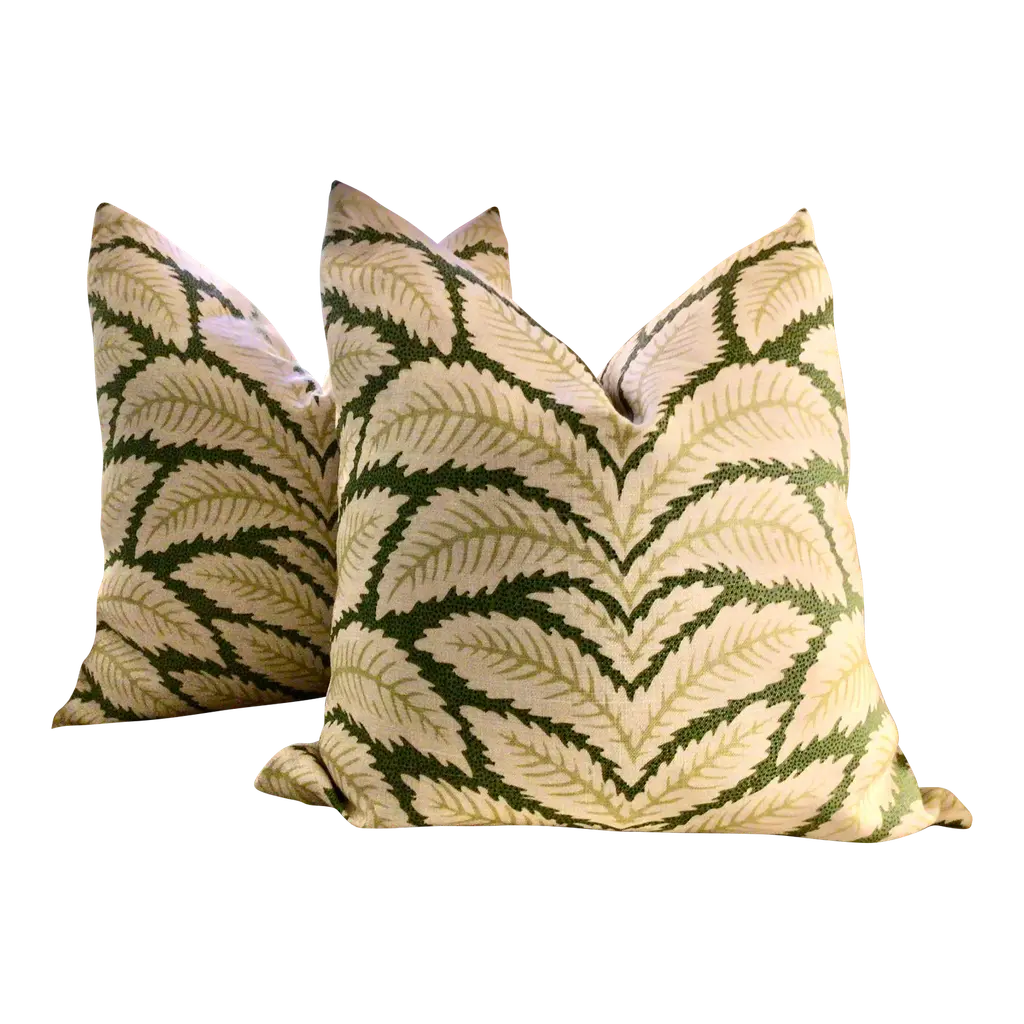 I love these indoor/ outdoor covers! This listing is for the off-white and green colorway. Scalamandre's Elsie de Wolfe fabric is an exquisite blend of elegance and whimsy. This luxurious textile features a charming pattern inspired by the iconic interior designer's style, combining delicate motifs with a sophisticated color palette. The fabric's refined quality and timeless appeal make it a perfect choice for discerning decorators seeking to add a touch of classic glamour to any space.These will come as a 22": pair with plush-down inserts. Closure is by way of an invisible zipper.About UsAt Accent Marks, each designer pillow is crafted with care using the finest hand-selected fabrics and trims, paired with durable, discreet invisible zippers. We specialize in creating beautiful, high-quality pieces that elevate your home decor. While most of our listings feature 22" pillow pairs, we also offer a range of sizes and single pillow options to suit your needs. All of our Accent Marks pillows are proudly made in the United States.If you don't see the fabric you're searching for, please reach out via message as we have other fabrics available upon request and can create anything that you like. Thank you for visiting Accent Marks!