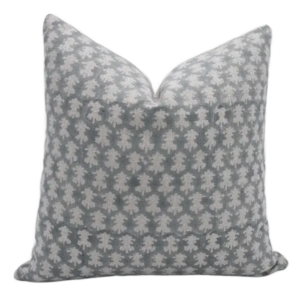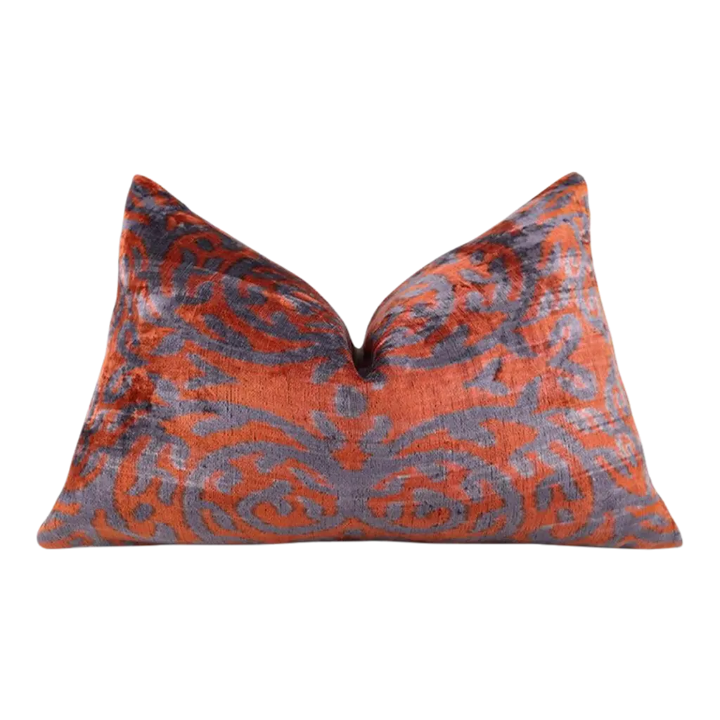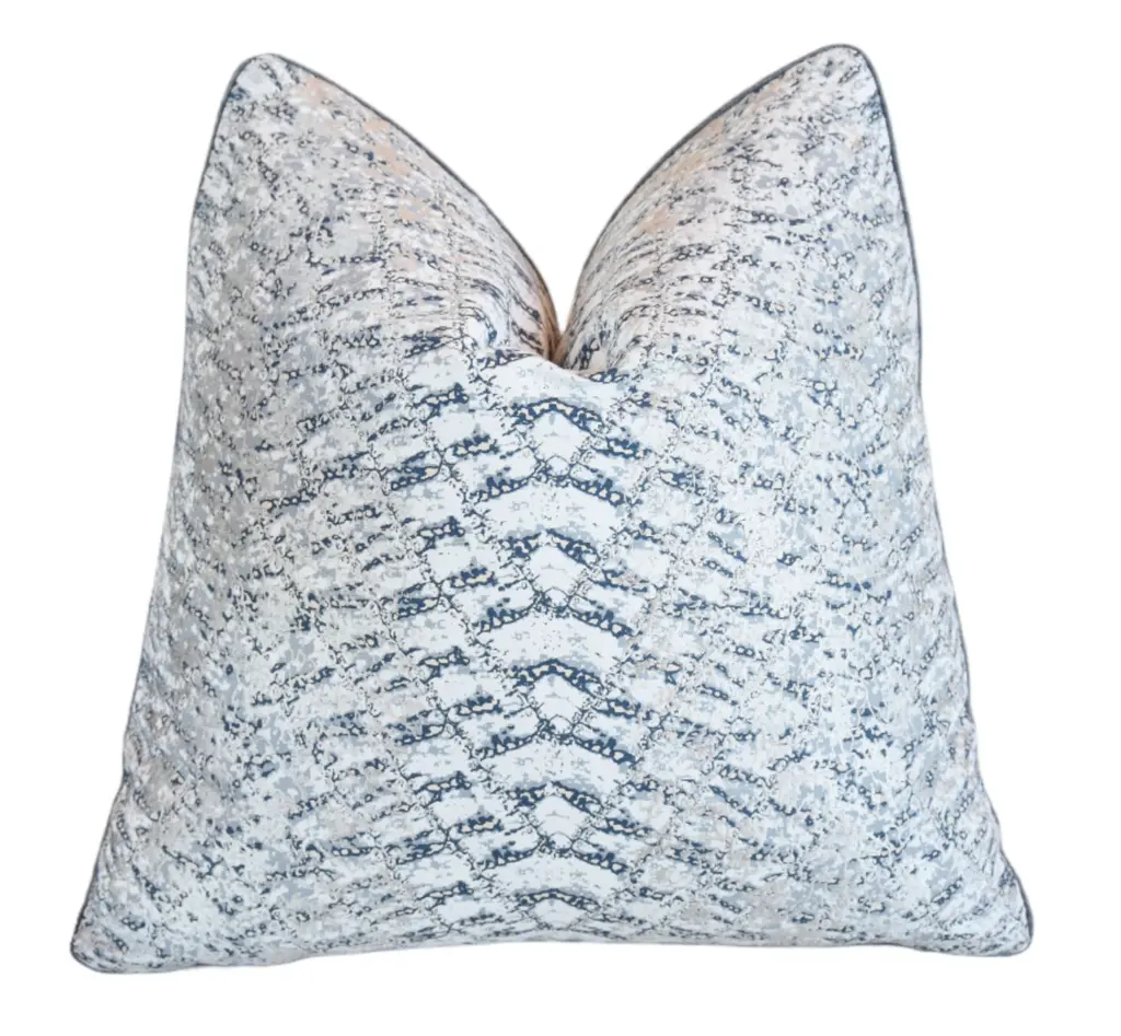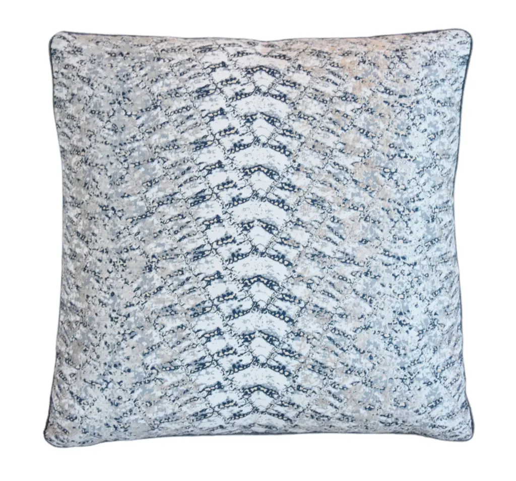 A custom-tailored designer pillow by Mike Seratt of The Prized Pig in Scalamandre fabric called "Komodo” depicts a stunning modern contemporary design. Gray wool fabric is on the reverse. Custom trim. Zipper closure. Generous plump goose feather and down insert. Excellent new, unused, beautiful condition!!