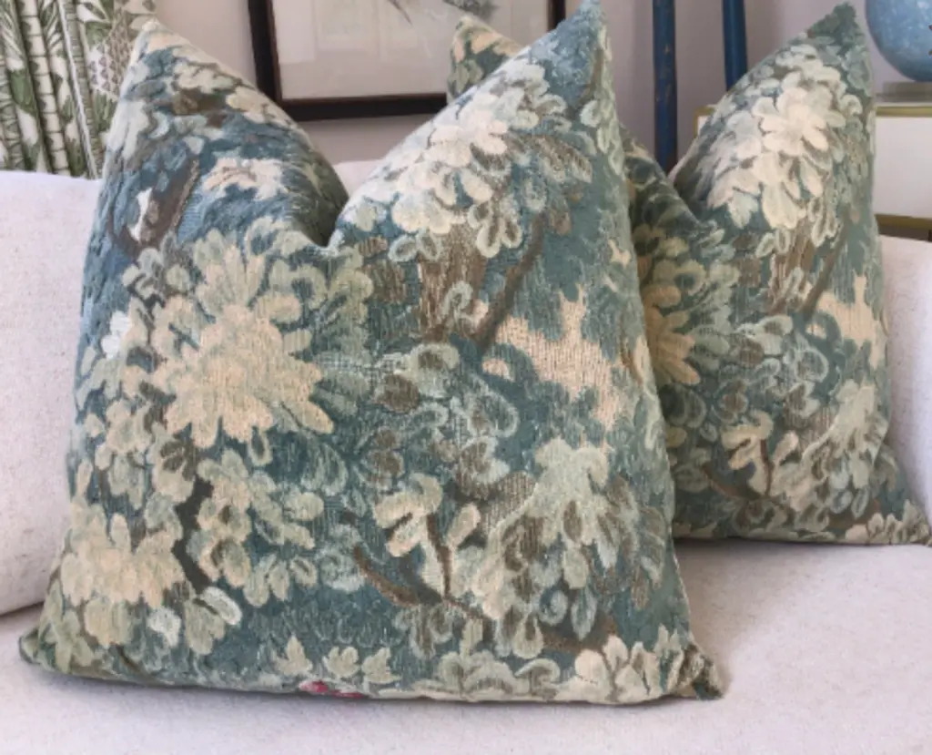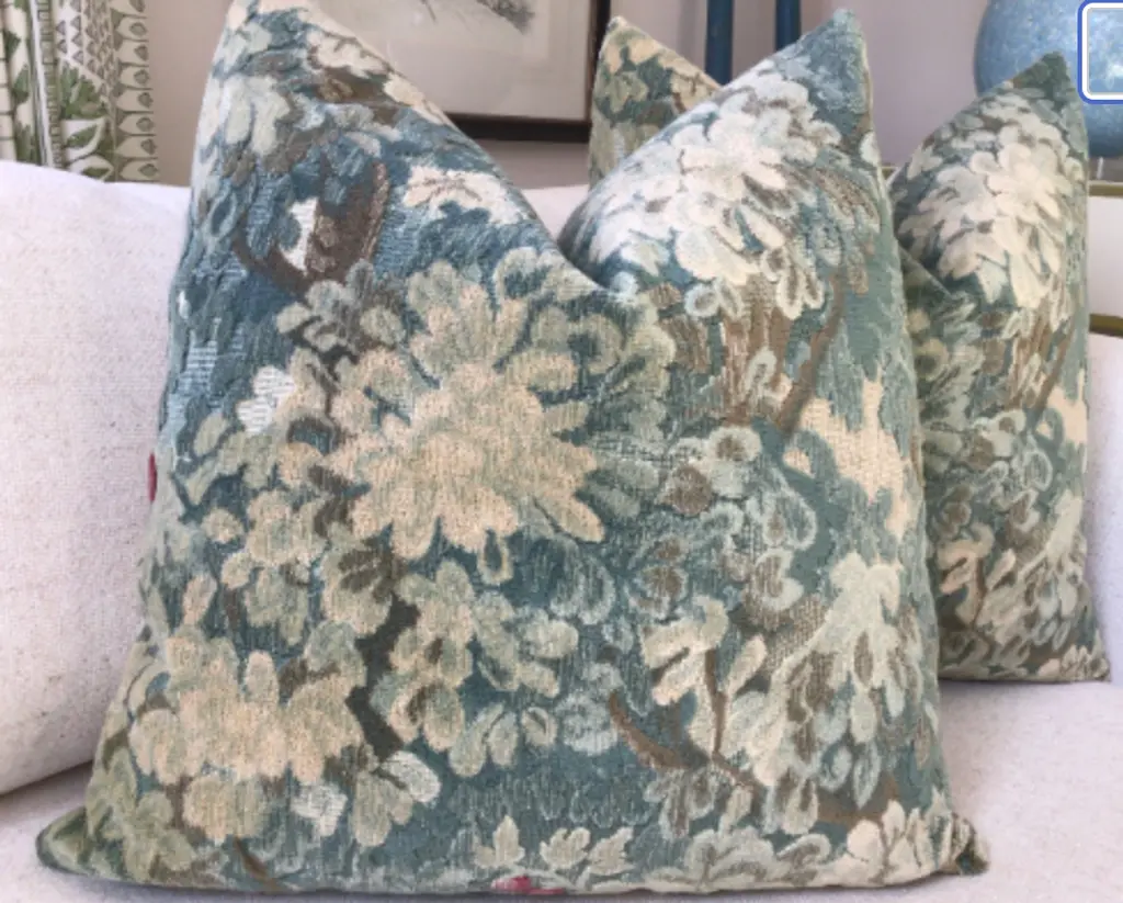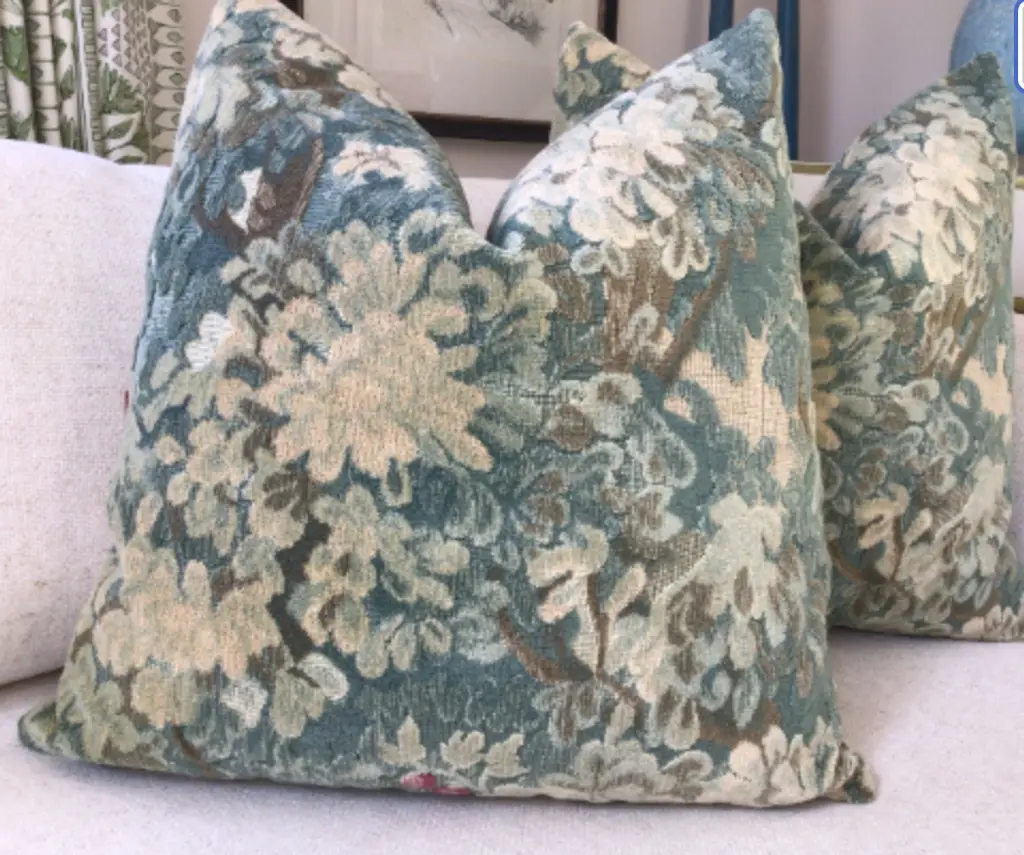 I’ve been waiting for some time now to get more of this luxurious fabric from Scalamandre! Marly in blue green is a very plush verdure pattern crafted from stunning velvet in a cut and uncut design. Please ask for a small sample If you are unsure. This is a beautiful shade of blue green but difficult to distinguish between blue shades if you are unfamiliar with the fabric. These are sold as 22"pairs with plush-down inserts. and will feature a coordinated soft tan velvet backing. The closure will be by way of an invisible zipper. Pattern placement may vary slightly.