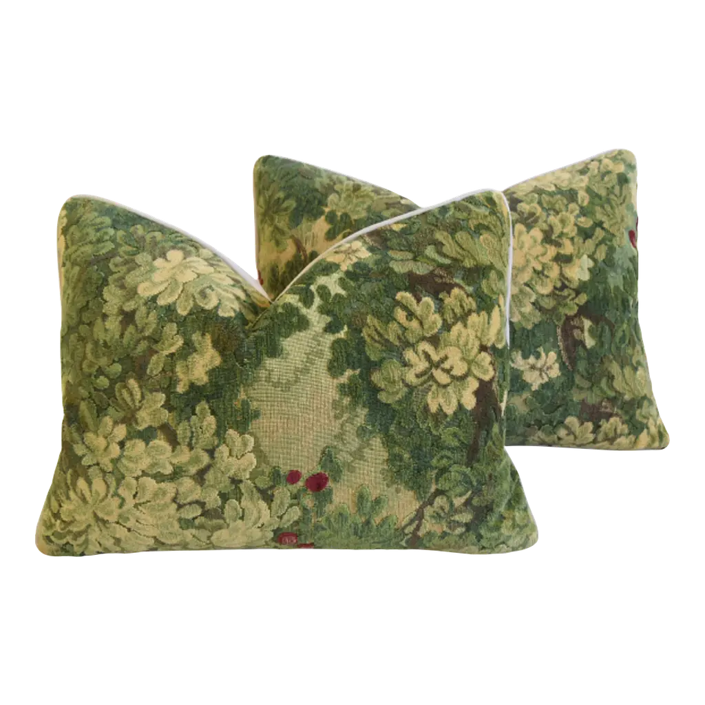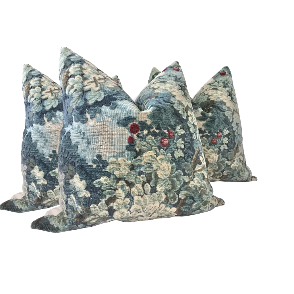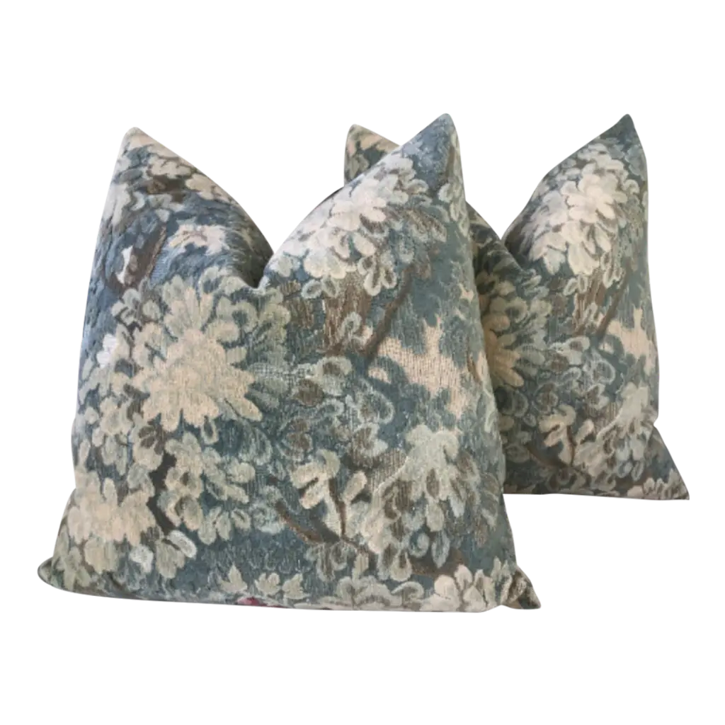 Scalamandre “Marly” Cut And Uncut Blue Green Verdure Velvet Pillows- A Pair