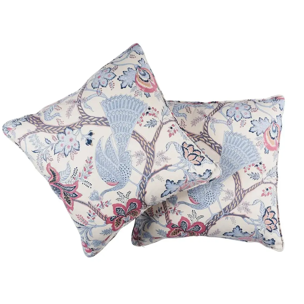 This pillow features Aveline Linen with a self welt finish. Aveline Linen in lilac is a beautiful handprinted fabric inhabited by regal peacocks and an undulating flowering vine, both rendered with fanciful, delicate details. Inspired by 19th-century Indian textiles. Pillow includes a feather/down fill insert and hidden zipper closure. Dry Clean Recommended