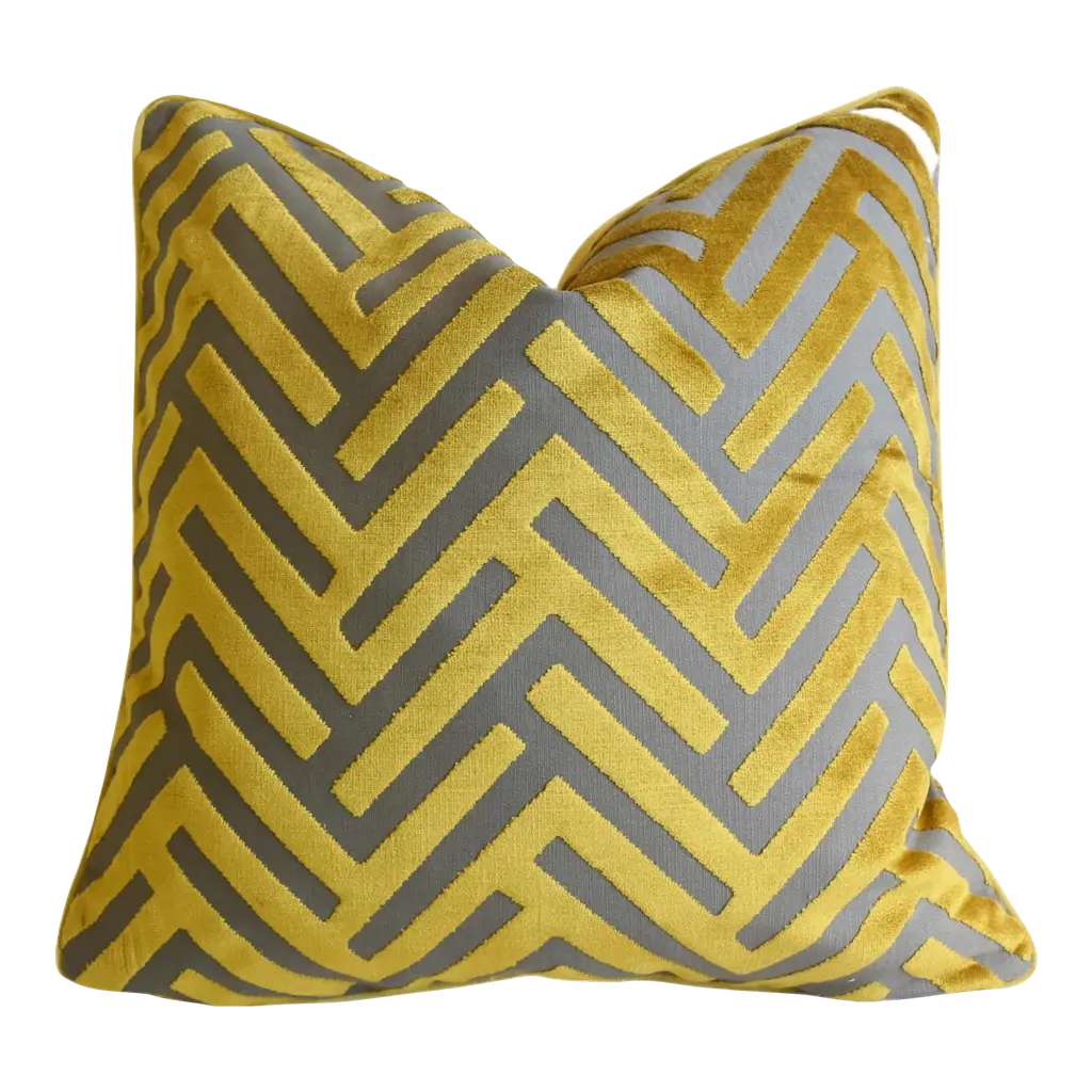 This pillow features Broken Chevron Cut Velvet by Miles Redd for Schumacher with a knife edge finish. Miles Redd was so charmed by a painted staircase photographed from above that he recreated it as taupe-on-ivory-colored Broken Chevron Velvet, a clever abstract cut-velvet fabric with a usable scale and lustrous hand. Pillow includes a feather/down fill insert and hidden zipper closure.If out of stock, lead-time is 15-20 business days approximately.Since Schumacher was founded in 1889, our family-owned company has been synonymous with style, taste, and innovation. A passion for luxury and an unwavering commitment to beauty are woven into everything we do. Pillows and accessories Product detail Pattern name: Albizia Embroidery Color: Blue & Green Hidden zipper closure Knife Edge Finish Feather/down fill insert included Content: 40% Linen, 31% Cotton, 29% Viscose Performance: N/A Pillow measures 18" x 18".