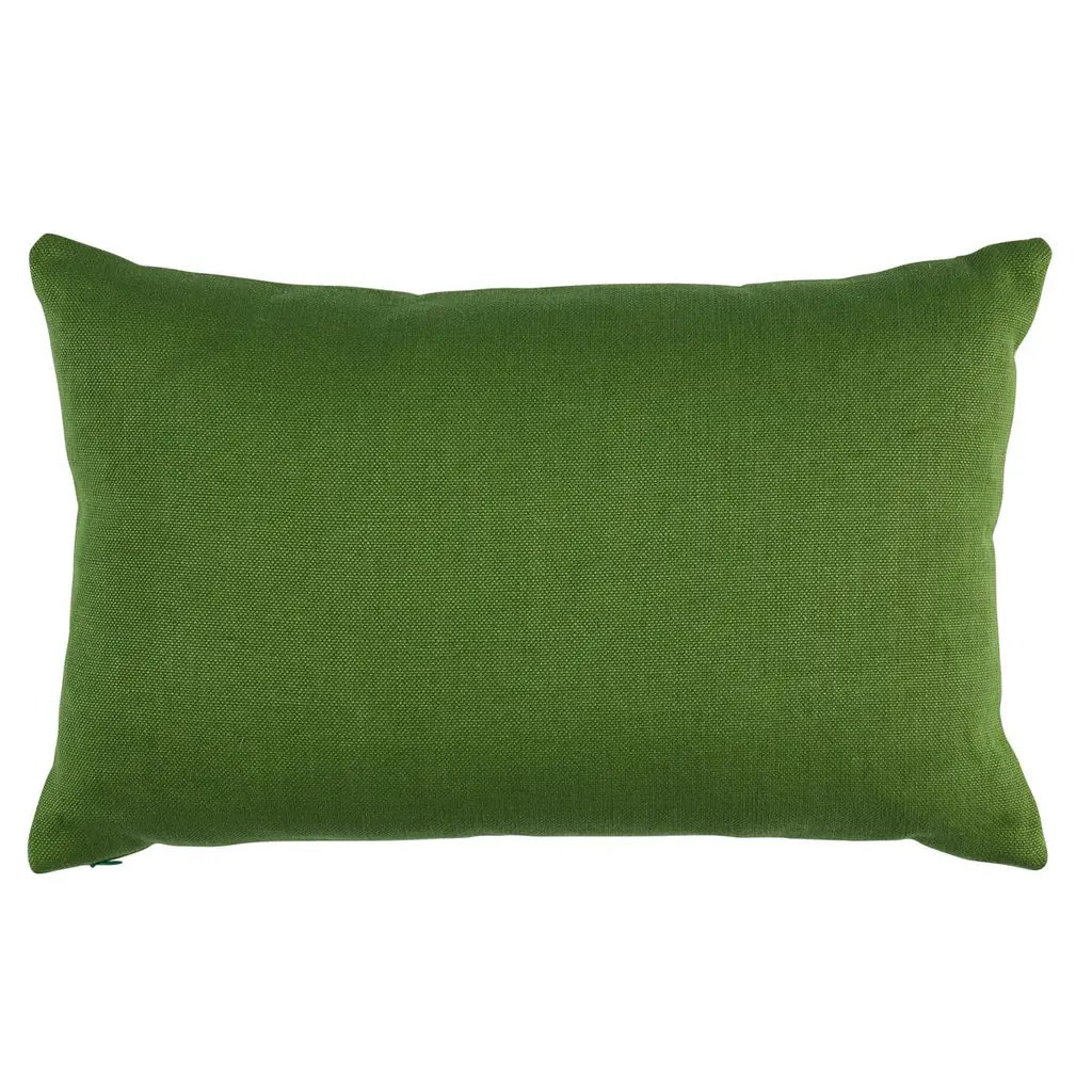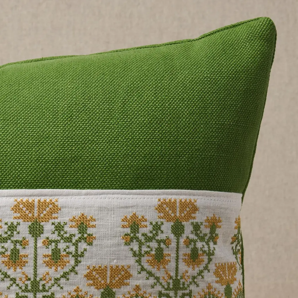 This pillow features Custis Stripe Embroidered Tape with a knife edge finish. Inspired by an 18th-century trim, Custis Embroidered Tape in marigold features wonderful stylized carnations stitched on a linen ground. The delicate pattern on this 3.5-inch-wide tape captures the artistry and charm of the original cross-stitched design. Body of pillow is Barnett. Pillow includes a feather/down fill insert and hidden zip closure.