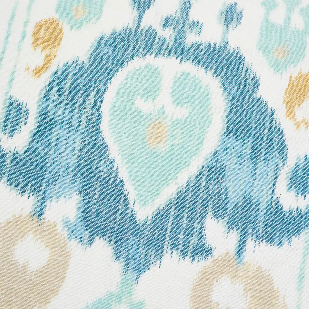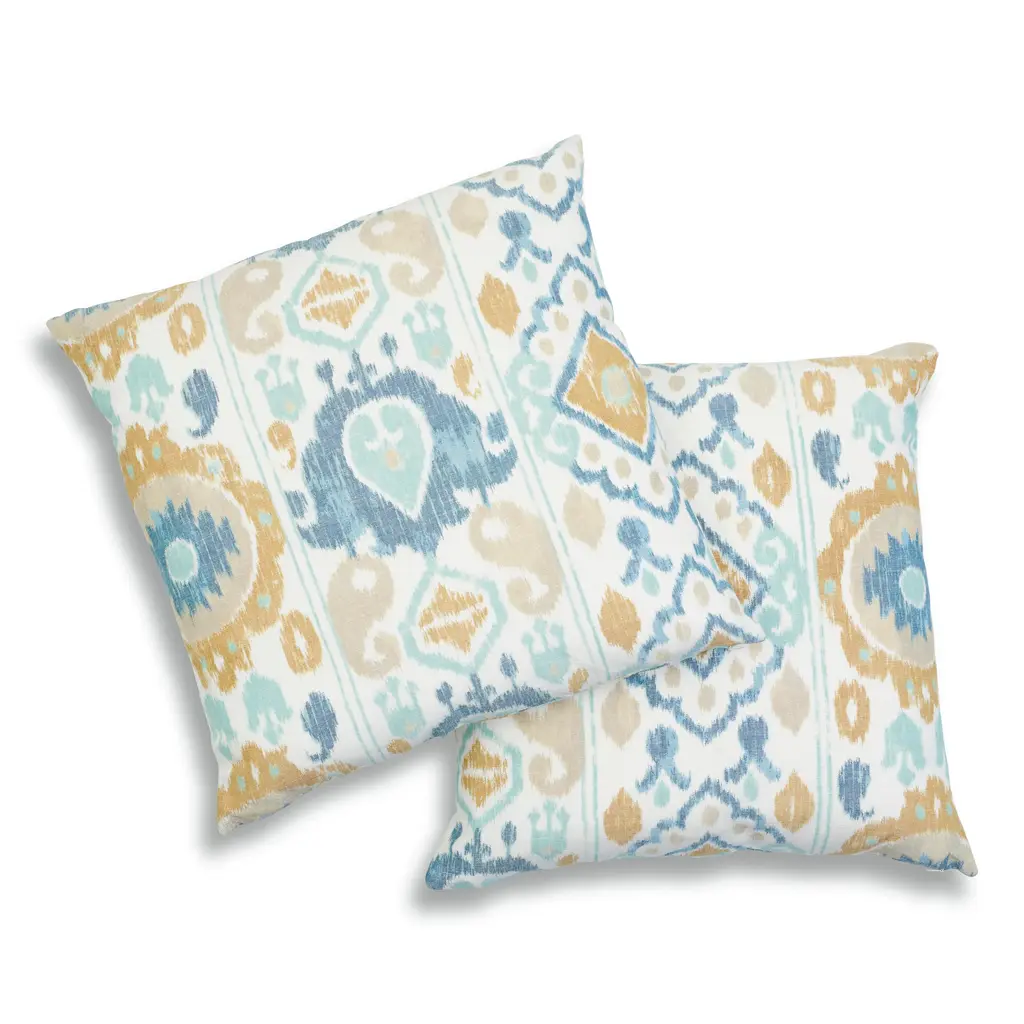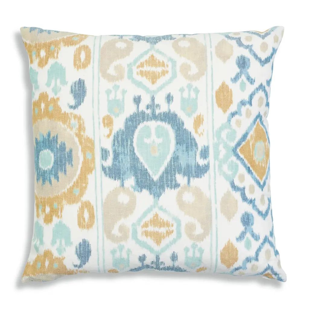 This 22" x 22" pillow features Elizia Ikat in Sky & Ochre. A true warp print ikat with watery colorations, this delicate stripe has an exotic vibe and is the perfect scale for upholstery. Feather/down insert included; knife edge; hidden zipper closure. 60% Linen, 40% Cotton. Dry Clean. Made in India. Since Schumacher was founded in 1889, our family-owned company has been synonymous with style, taste, and innovation. A passion for luxury and an unwavering commitment to beauty are woven into everything we do.