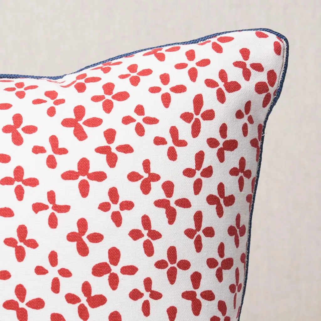 This pillow features Emerson. Inspired by a quatrefoil, Emerson in red is a fun small-scale print with a big personality. Imperfect by design, this casual cotton fabric has a lovely hand-painted feel. Pillow is finished with a welt in Cedric Cotton Lip Cord Narrow. Welt contents: 48% fibranne, 36% cotton, 14% polyester and 2% nylon. Pillow includes a feather/down fill insert and hidden zipper closure.If out of stock, lead-time is 15-20 business days approximately.Since Schumacher was founded in 1889, our family-owned company has been synonymous with style, taste, and innovation. A passion for luxury and an unwavering commitment to beauty are woven into everything we do. Pillows and accessories Product detail Pattern name: Albizia Embroidery Color: Blue & Green Hidden zipper closure Knife Edge Finish Feather/down fill insert included Content: 40% Linen, 31% Cotton, 29% Viscose Performance: N/A Pillow measures 18" x 18".