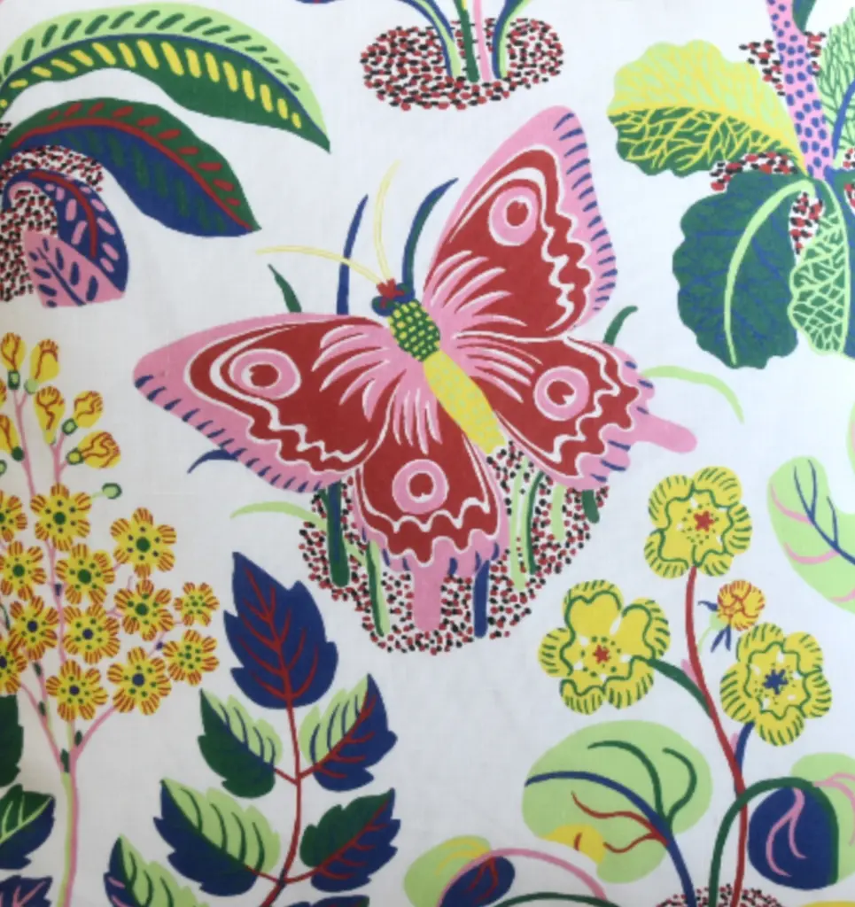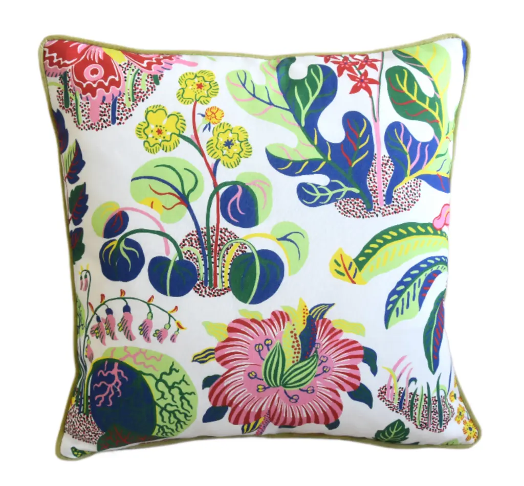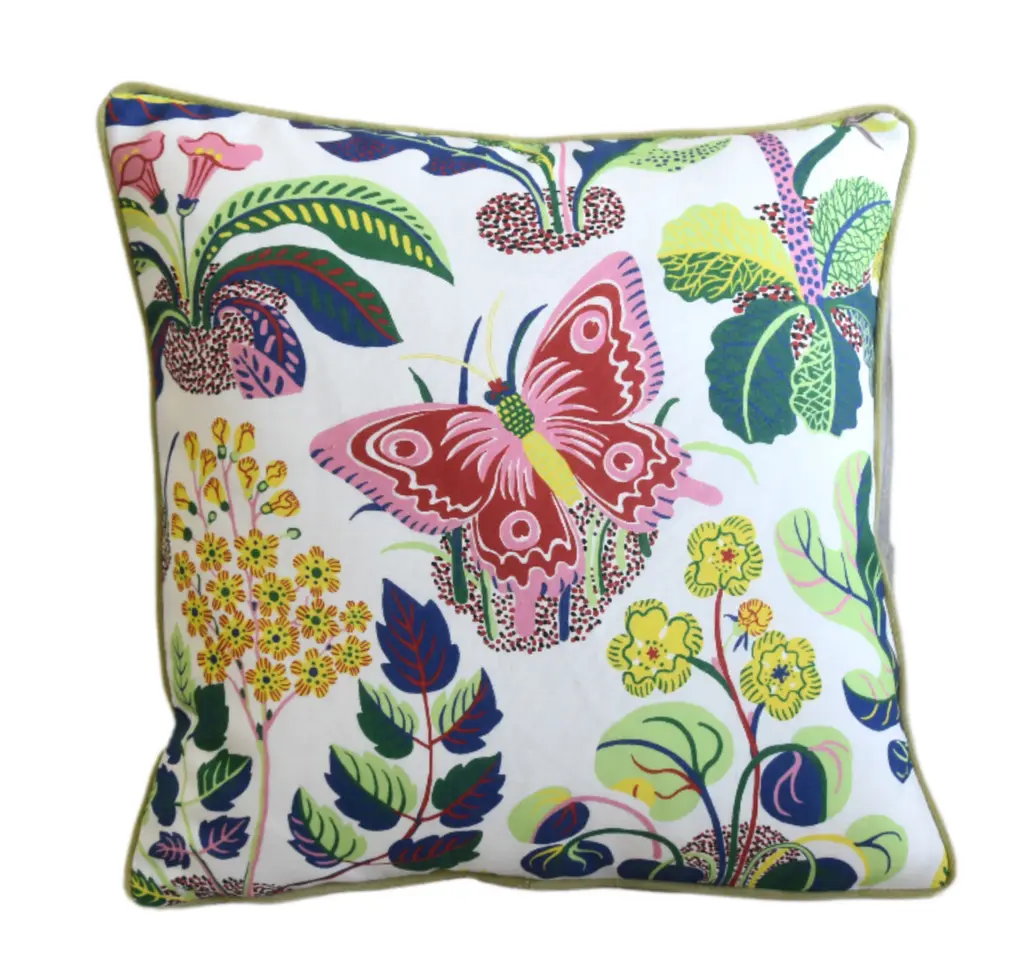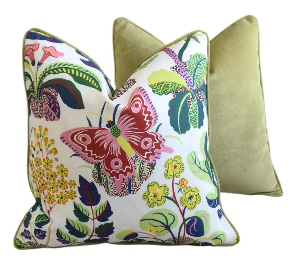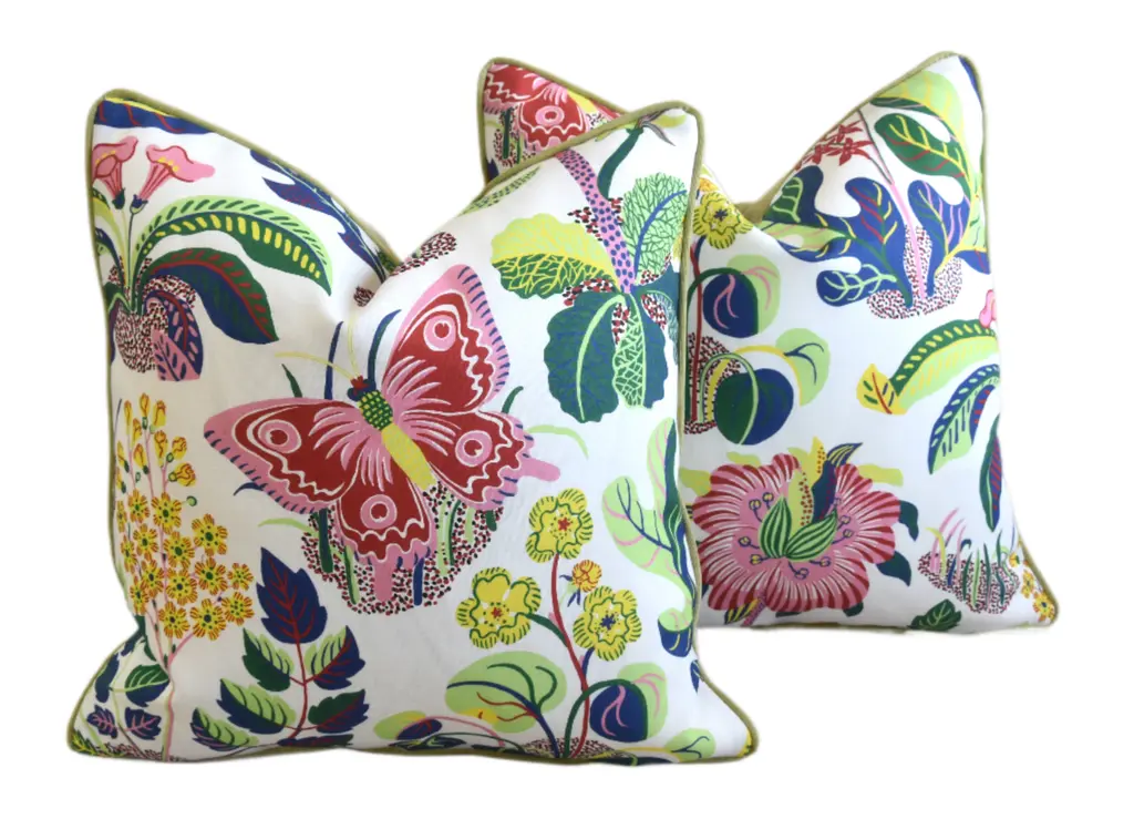 Pair of custom-tailored pillows by Mike Seratt of The Prized Pig in Schumacher "Exotic Butterfly Spring" fabric, a faithful reproduction of a never-before-seen design by designer Josef Frank. Pillow's backs are a complementary green velvet fabric. Pillows are beautifully accented with custom cord piping trim. Zipper closures. New generous goose feather-and-down inserts. The photos of the listed pillows are the actual pillows you will receive. Excellent, new, unused, beautiful condition!!
