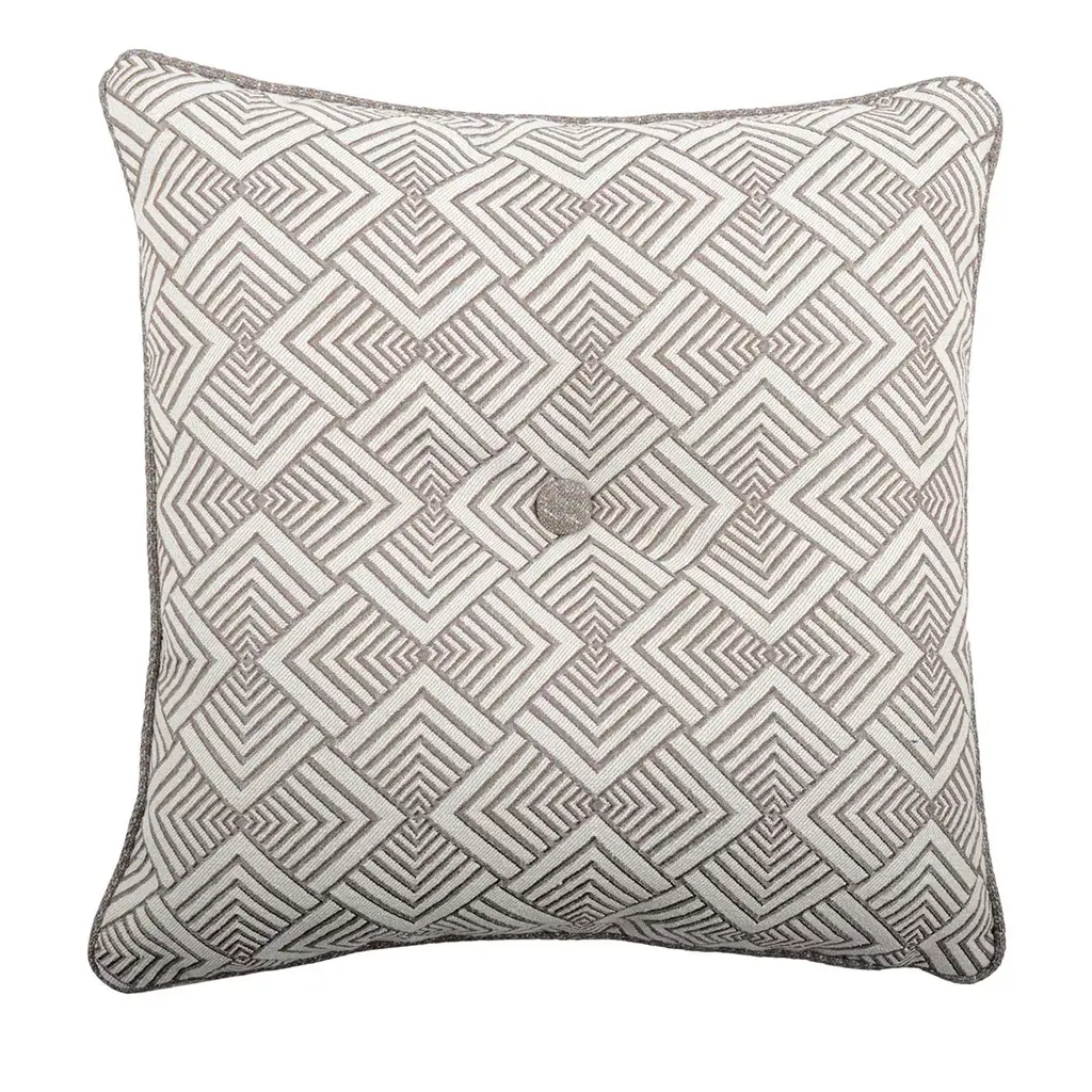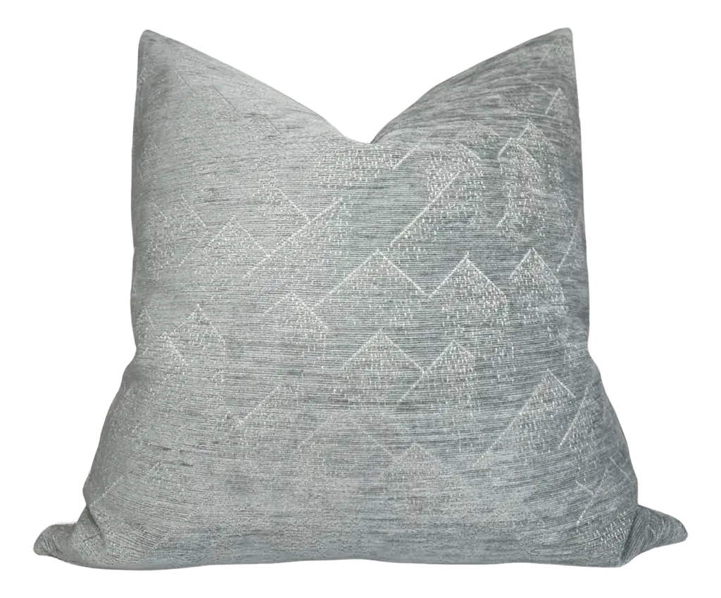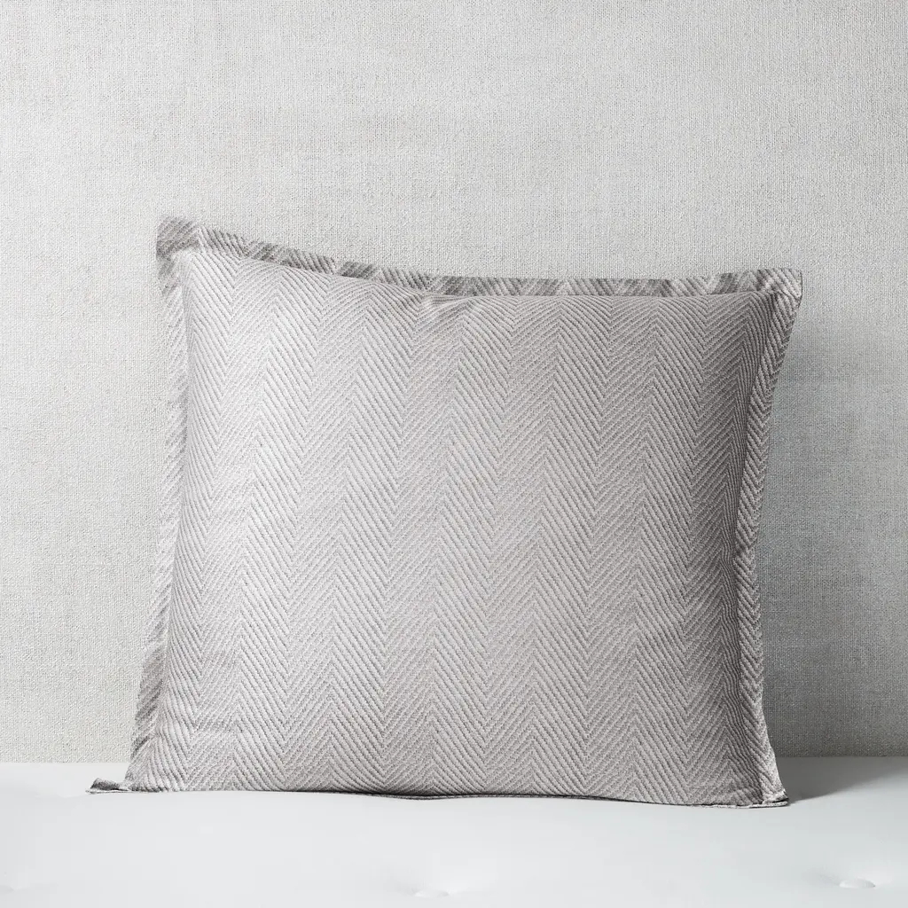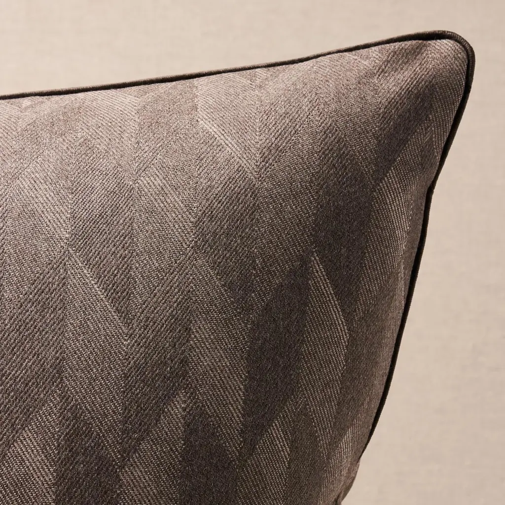 This pillow features Ezra Wool. A soft, textural weave, Ezra Wool in basalt features a subtle allover chevron pattern with a sophisticated tailored aesthetic. Pillow is finished with a welt in Sophia Velvet fabric. Welt content: 39% modal viscose, 61% cotton. Pillow includes a feather/down fill insert and hidden zip closure.