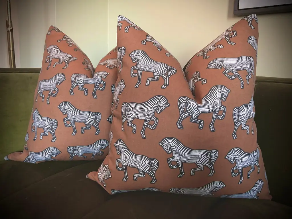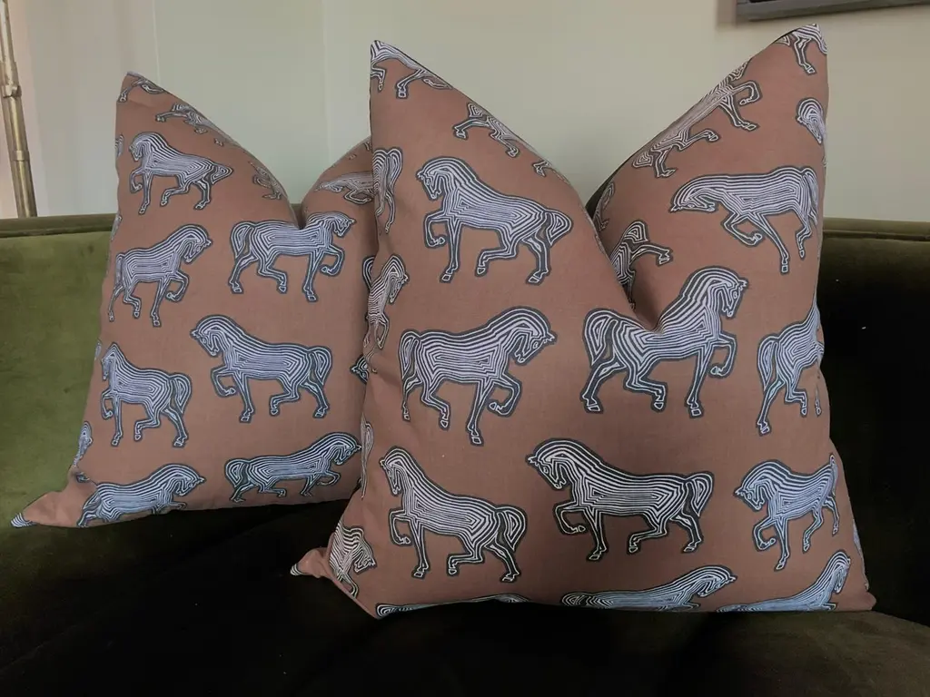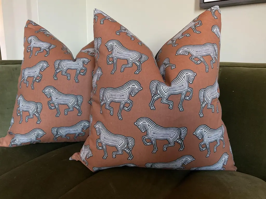 Fabulous heavy linen from high end fabric house Schumacher! This lovely material in a soft cocoa brown features white-striped horses trotting across the scene! Equally at home in traditional and modern schemes, this chic, graphic print adds equestrian flair to any room. Handsome and sophisticated. These will be backed in plush black velvet.About UsAt AccentMarks, each designer pillow is crafted with care using the finest hand-selected fabrics and trims, paired with durable, discreet invisible zippers. We specialize in creating beautiful, high-quality pieces that elevate your home decor. While most of our listings feature 22" pillow pairs, we also offer a range of sizes and single pillow options to suit your needs. All of our pillows are proudly made in the United States.If you don't see the fabric you're searching for, please reach out via message as we have other fabrics available upon request and can create anything that you like. Thank you for visiting AccentMarks!
