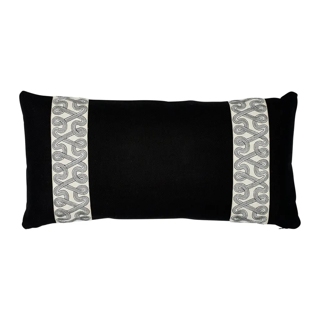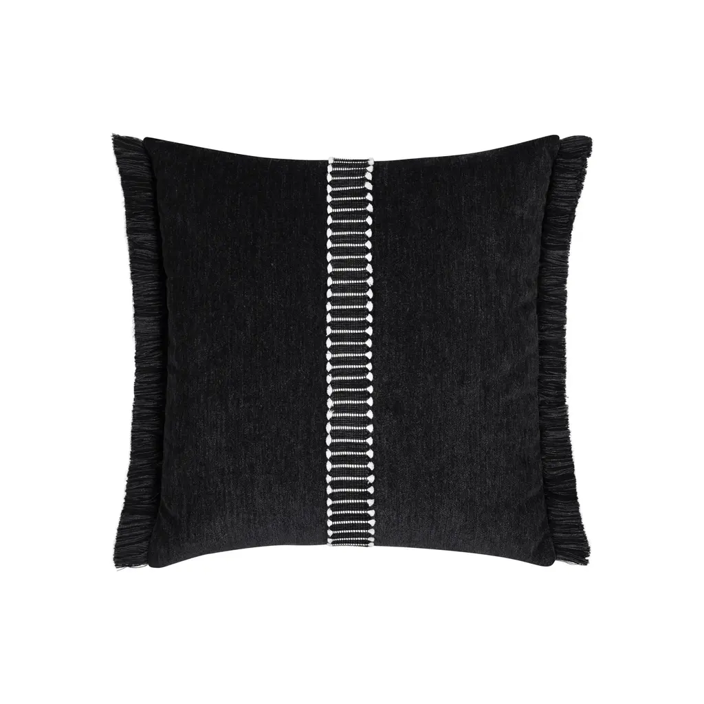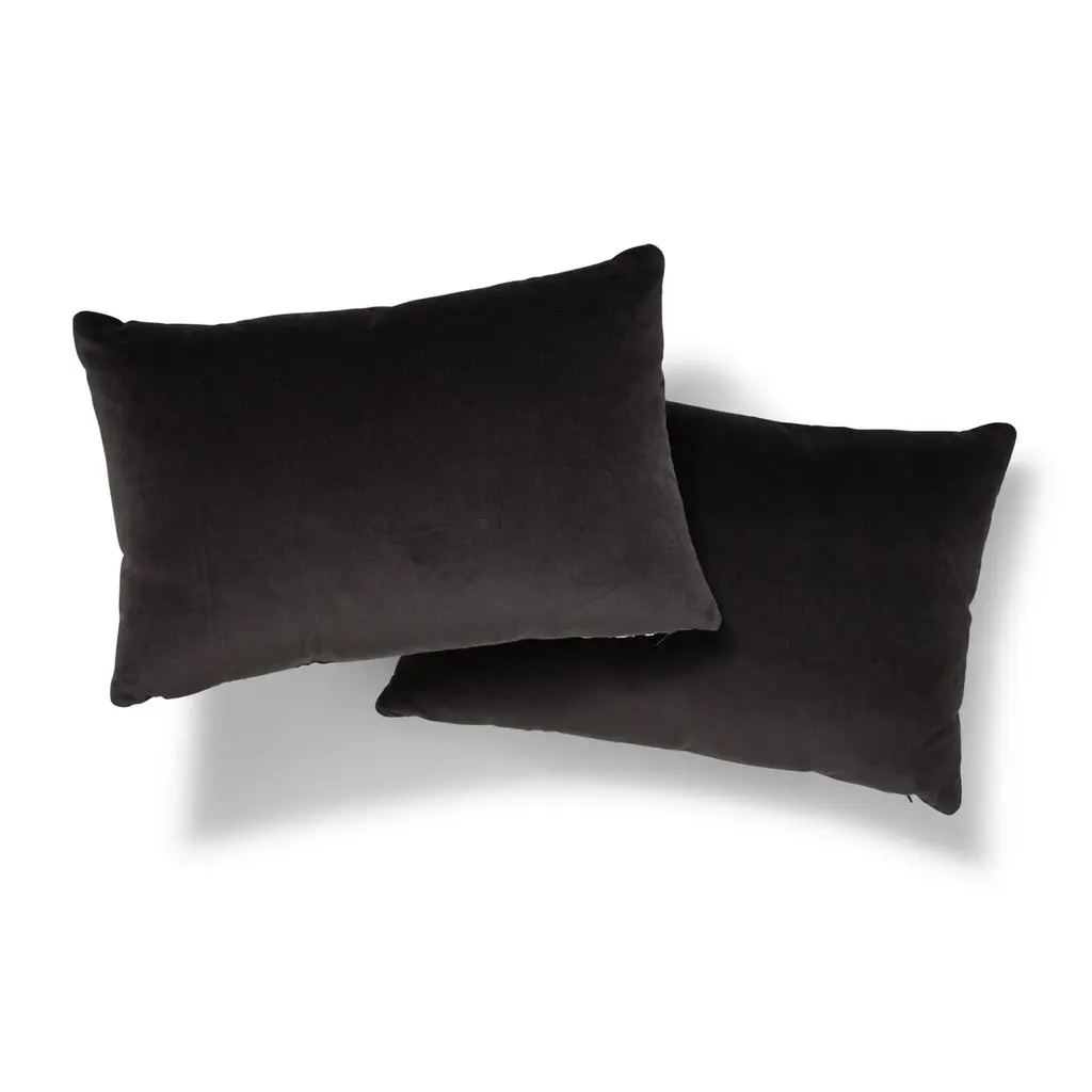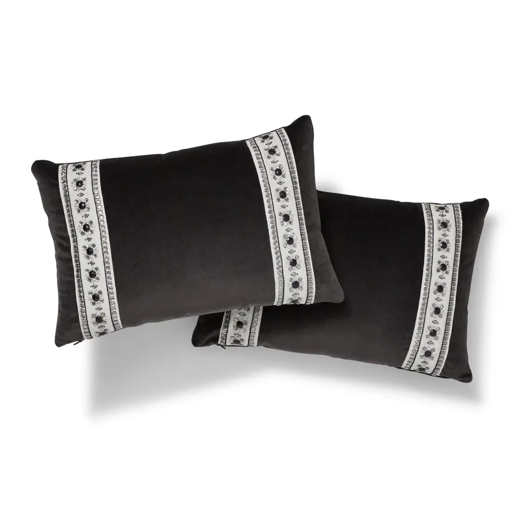 This 12" x 18" pillow features Gainsborough Velvet in Raven paired with trims in Maria Tape in Jet. Woven in the Netherlands, Schumacher's signature cotton velvet is available in nearly 300 colors. A short, dense pile and sumptuous texture give this fabric a beautiful depth. Feather/down fill insert included; knife-edge finish, hidden zipper closure. 100% Cotton. Dry Clean. Made in the Netherlands. If out of stock, lead-time is 15-20 business days approximately. Since Schumacher was founded in 1889, our family-owned company has been synonymous with style, taste, and innovation. A passion for luxury and an unwavering commitment to beauty are woven into everything we do. Pillows and accessories Product detail Pattern name: Gainsborough Velvet Color: Raven Hidden zipper closure Knife Edge Feather/down fill insert included Gainsborough Velvet Fabric Content: 100% Cotton Performance: Wyzenbeek 40,000 Maria Tape Content: 45% Acrylic Beads, 25% Linen, 21% Plastic Beads, 8% Glass Beads Performance: N/A Pillow measures 12"x 18".