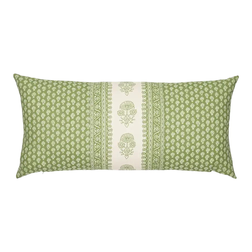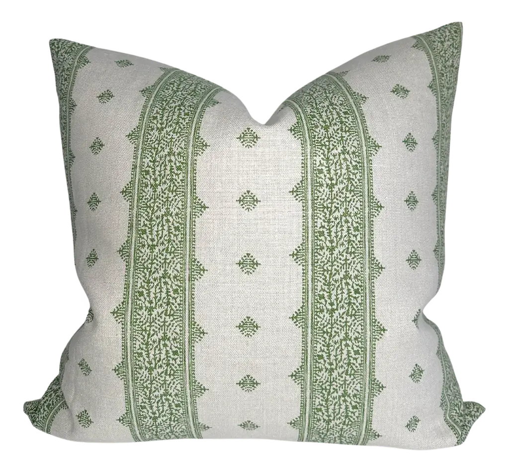 This pillow features Hyacinth Indoor/Outdoor by Mark D. Sikes for Schumacher with a knife edge finish. Inspired by traditional Indian block prints, Hyacinth Indoor/Outdoor in leaf green by Mark D. Sikes is a stylish high-performance fabric that can stand up to the elements. Pillow includes a polyfill insert and hidden zipper closure.If out of stock, lead-time is 15-20 business days approximately.