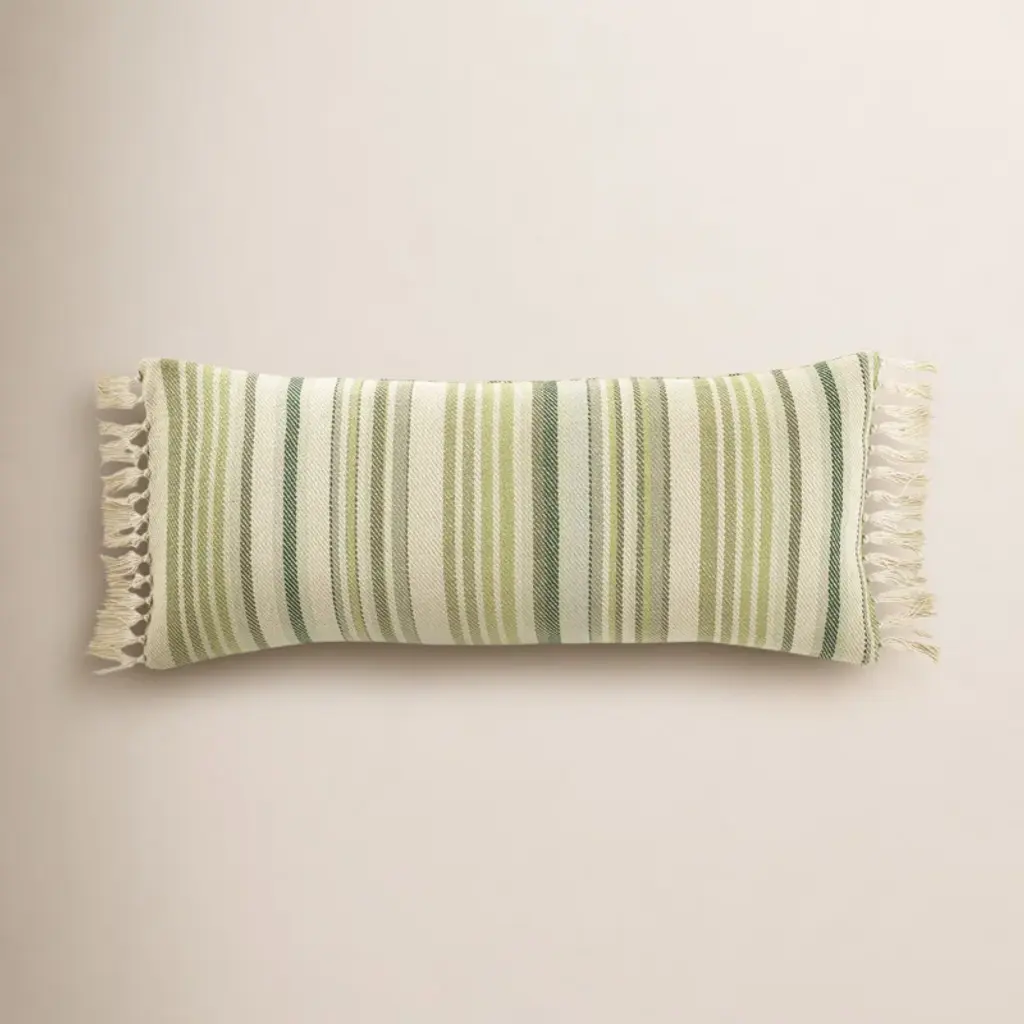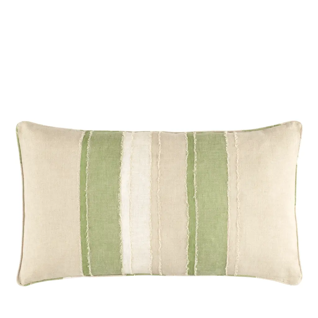 This pillow features Mathis Ticking Stripe with a welt on a bias finish. Printed on a linen-hemp blend with a running-stitch detail, Mathis Ticking Stripe in sage is an interesting, textural take on traditional mattress ticking. Pillow includes a feather/down fill insert and hidden zipper closure.If out of stock, lead-time is 15-20 business days approximately.