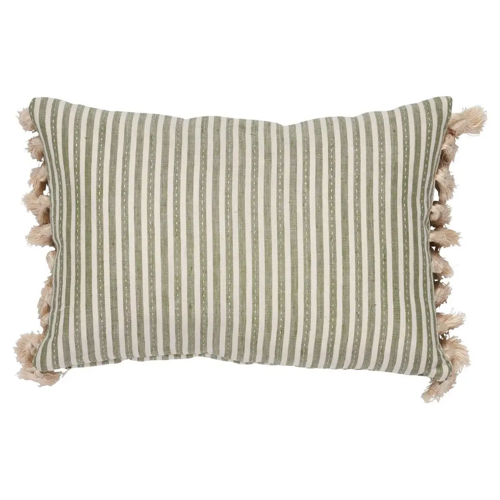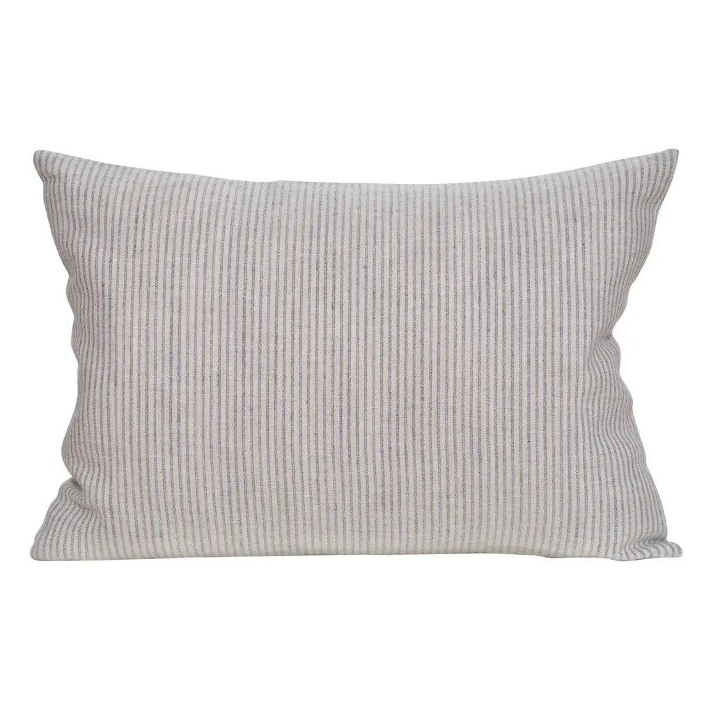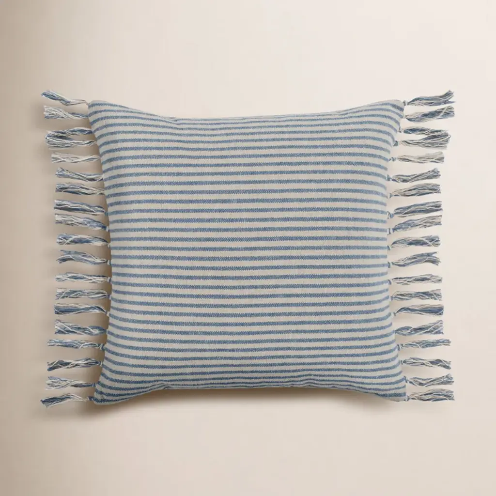 This pillow features Mathias Ticking Stripe with a knife edge finish on top and bottom. Printed on a linen-hemp blend with a running-stitch detail, Mathis Ticking Stripe in sky is an interesting, textural take on traditional mattress ticking. Sides are finished with Berber Cotton Tassel fringe. Pillow includes a feather/down fill insert and hidden zipper closure.If out of stock, lead-time is 15-20 business days approximately.