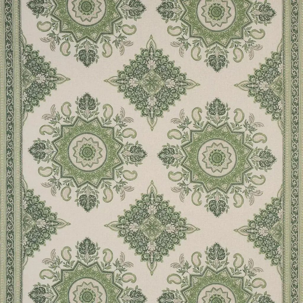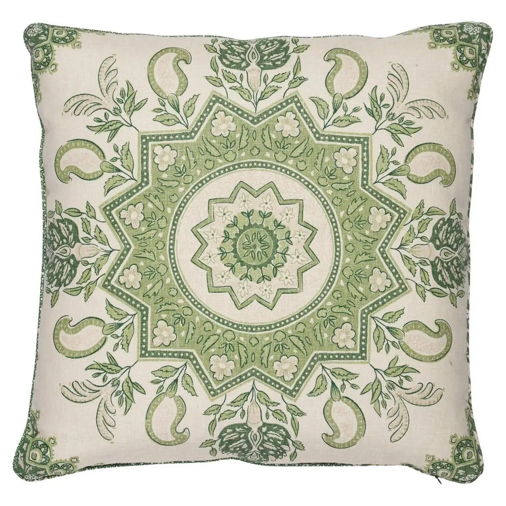 This pillow features Montecito Medallion by Mark D. Sikes for Schumacher with a self welt finish. This stunning large-scale medallion in leaf green evokes timeless motifs from India and Turkey for a chic, global vibe. Pillow includes a feather/down fill insert and hidden zipper closure.If out of stock, lead-time is 15-20 business days approximately.