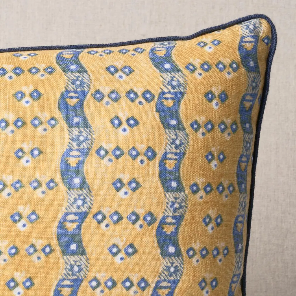 This pillow features Ottilie Stripe. A unique and intricately detailed scalloped stripe, Ottilie Stripe in yellow has subtle tonalities and extraordinary depth. Printed on a 100% linen ground and slightly off-register, this wonderful pattern evokes the imperfect beauty of handmade textiles. Pillow is finished with a welt in Cedric Cotton Lip Cord Narrow. Welt contents: 48% fibranne, 36% cotton, 14% polyester and 2% nylon. Pillow includes a feather/down fill insert and hidden zipper closure.If out of stock, lead-time is 15-20 business days approximately.