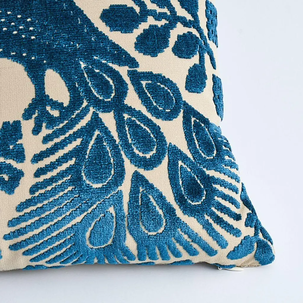 This pillow features Pavone Velvet with a knife edge finish. A host of sources, from Peruvian weavings to Ukranian embroidery, inspired this design. Its imaginative combination of peacocks and flowers with a mirrored repeat have an enchanting, antique look. Back of pillow features Piet Performance Linen. Pillow includes a feather/down fill insert and hidden zipper closure.