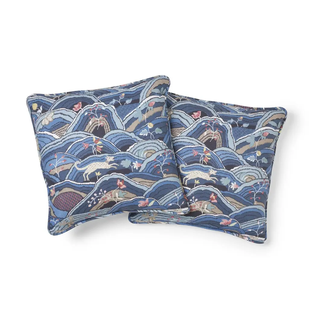 This 18" x 18" pillow features Rolling Hills in Blue, a whimsical full-coverage print that showcases charming animals frolicking in a naive landscape. This design preserves the rustic simplicity of the embroidered original, which dated back to 1960. Feather/down fill insert included; self welt finish; hidden zipper closure. 100% Linen. Dry Clean. Made in Thailand. If out of stock, lead-time is 15-20 business days approximately.Since Schumacher was founded in 1889, our family-owned company has been synonymous with style, taste, and innovation. A passion for luxury and an unwavering commitment to beauty are woven into everything we do. Pillows and accessories Product detail Pattern name: Rolling Hills Color: Blue Fully wrapped (pattern on both sides) Hidden zipper closure Self welt edge Feather/Down fill insert included Content: 100% linen Performance: N/A Pillow measures 18".
