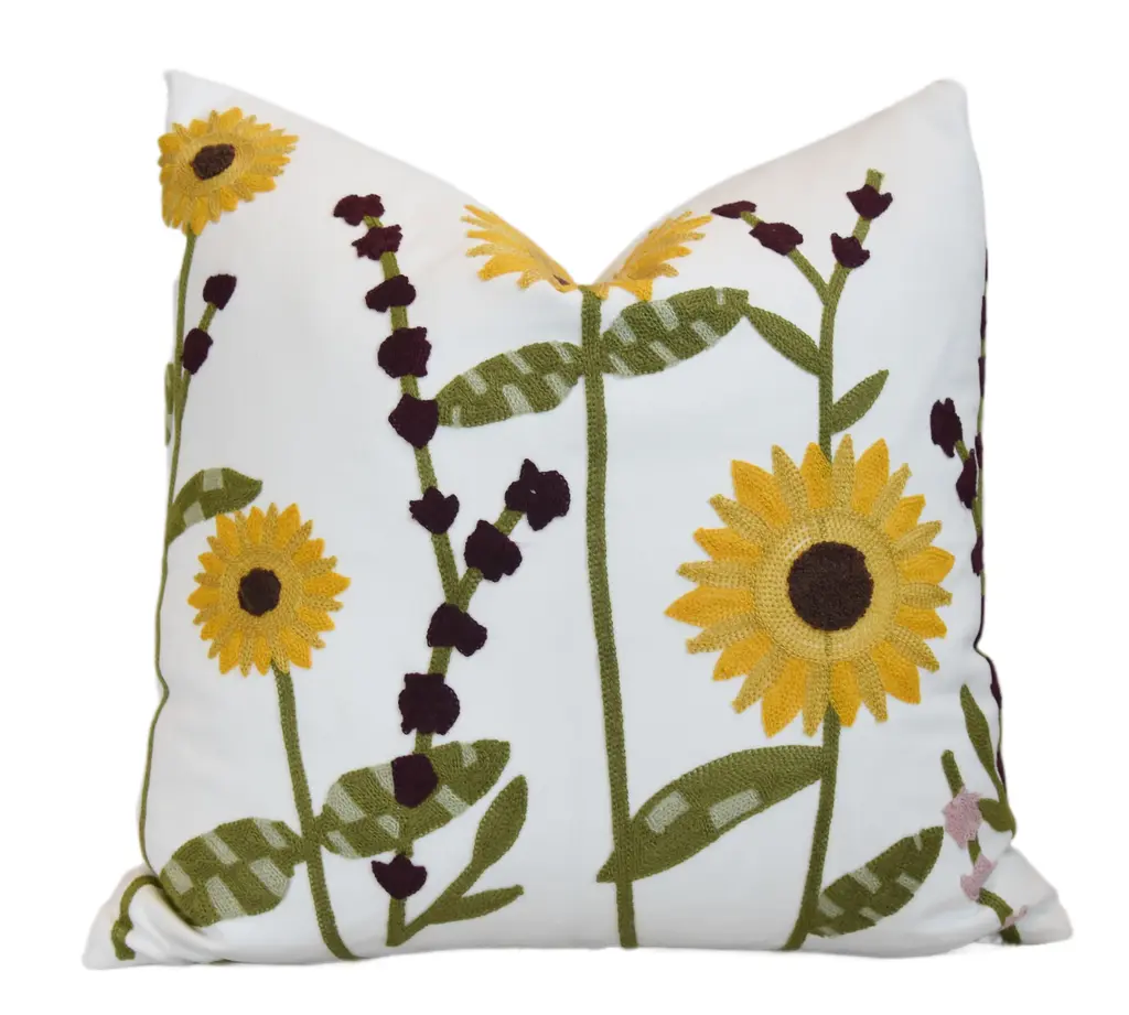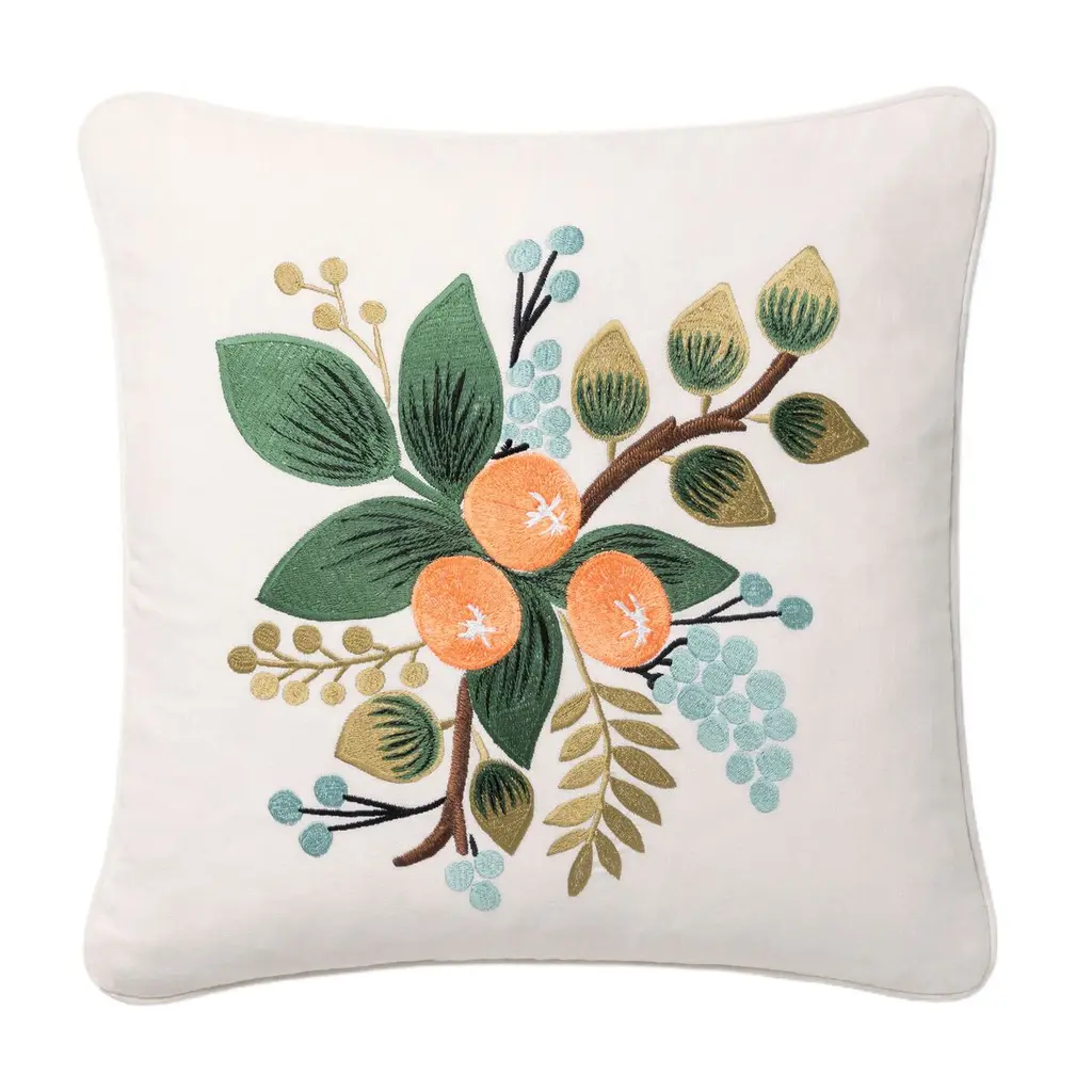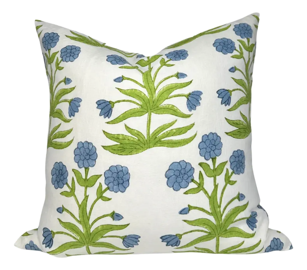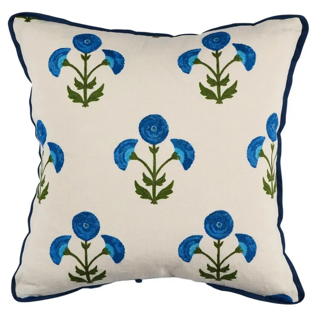 This pillow features Saranda Flower and is finished with a flange in Elliott Brushed Cotton. Inspired by traditional Indian hand-block designs, this marigold-colored Saranda Flower Embroidery features stylized flowers handprinted on a linen-ground fabric for a painterly bouquet full of color and depth. Pillow includes a feather/down fill insert and hidden zipper closure. Contents: 33% Cotton, 67% Linen Care Instructions: DRY CLEAN RECOMMENDED
