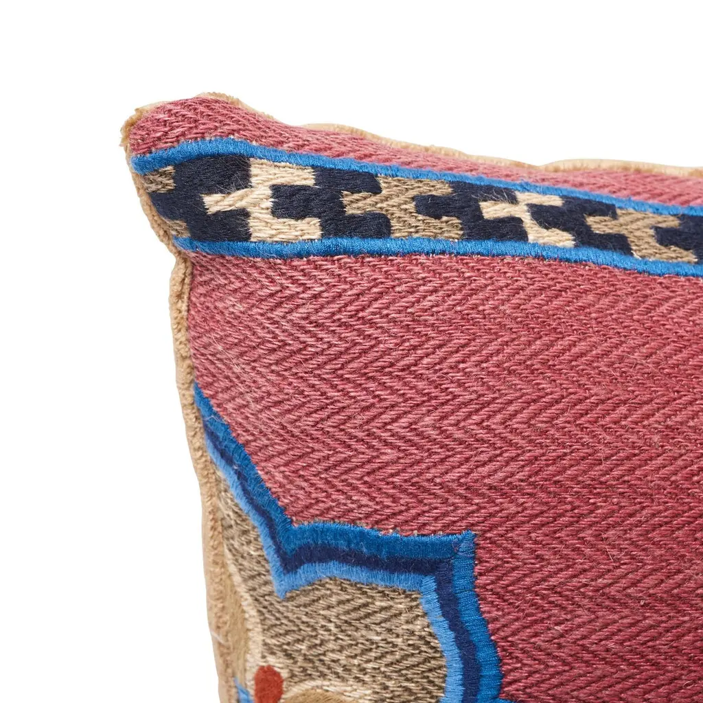 The front of this 25" x 16" pillow features Temara Embroidered Print in Pomegranate. This ethnic beauty is handprinted on a linen and jute ground and is embellished with embroidery. Subtle variations are a part of its inherent natural beauty. The back of the pillow features Schumacher Antique Linen Fabric in Doe. Feather/down fill insert included; knife-edge finish, hidden zipper closure. 48% linen, 29% jute, 23% polyester. Dry clean. Made in India. If out of stock, lead-time is 15-20 business days approximately. Since Schumacher was founded in 1889, our family-owned company has been synonymous with style, taste, and innovation. A passion for luxury and an unwavering commitment to beauty are woven into everything we do. Pillows and accessories Product detail Pattern name: Temara embroidered print Color: Pomegranate Hidden zipper closure Knife edge Feather/down fill insert included Content: Front: 48% linen, 29% jute, 23% polyester Back: 55% linen, 45% cotton Performance: Martindale 40,000 Pillow measures 25" x 16".