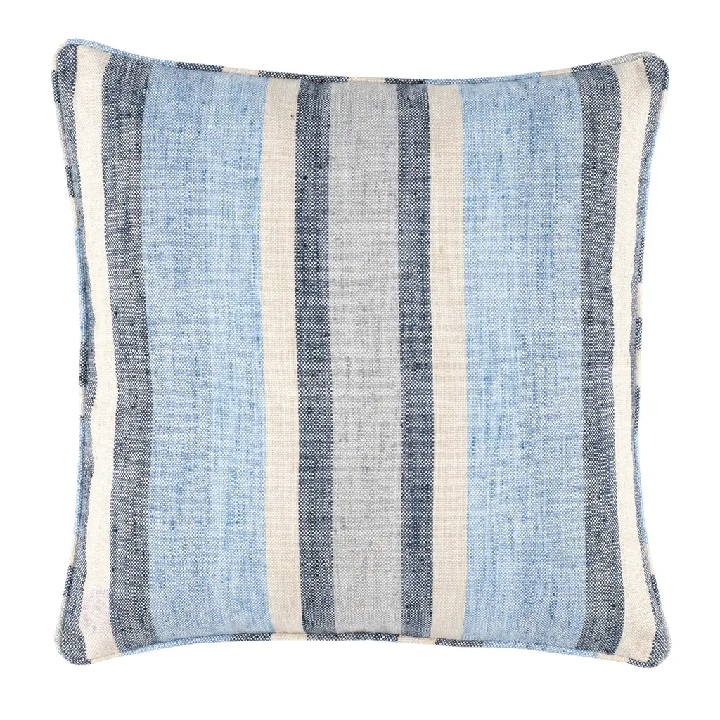 This pillow features Tierra Stripe with a knife edge finish. Inspired by a vintage handwoven blanket, this textural, tonal offset stripe in blue gets its velvety hand from a blend of chunky cotton and linen chenille yarns. Soft yet substantial, Tierra Stripe is a fabulous upholstery-weight fabric with an alluring touch and artisanal look. Pillow includes a feather/down fill insert and hidden zipper closure.