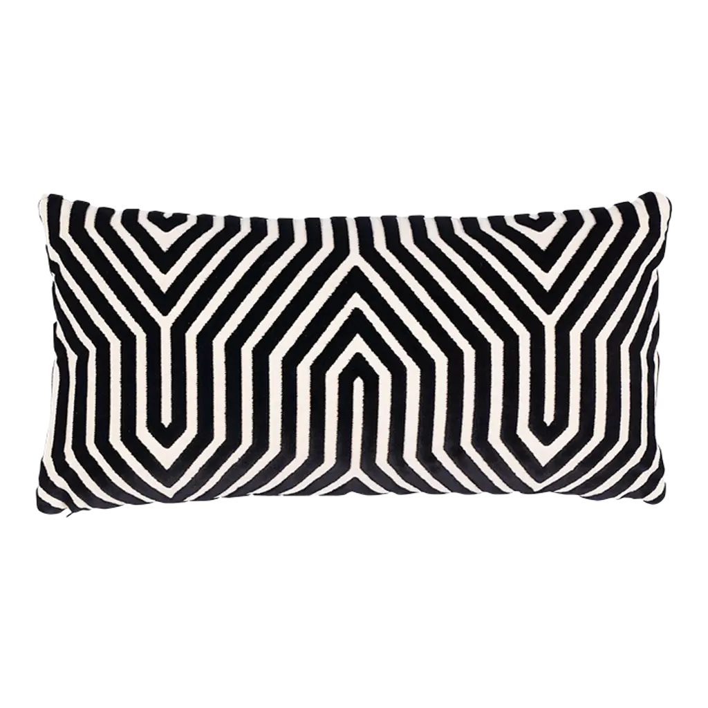 This pillow features Vanderbilt Velvet by Mary McDonald for Schumacher with a knife edge finish. A large-scale, linear design gives this Italian cut velvet fabric a graphic sensibility. The silk-like pile adds extra dimension and a luxurious hand to this upholstery woven. Pillow includes a feather/down fill insert and hidden zip closure.