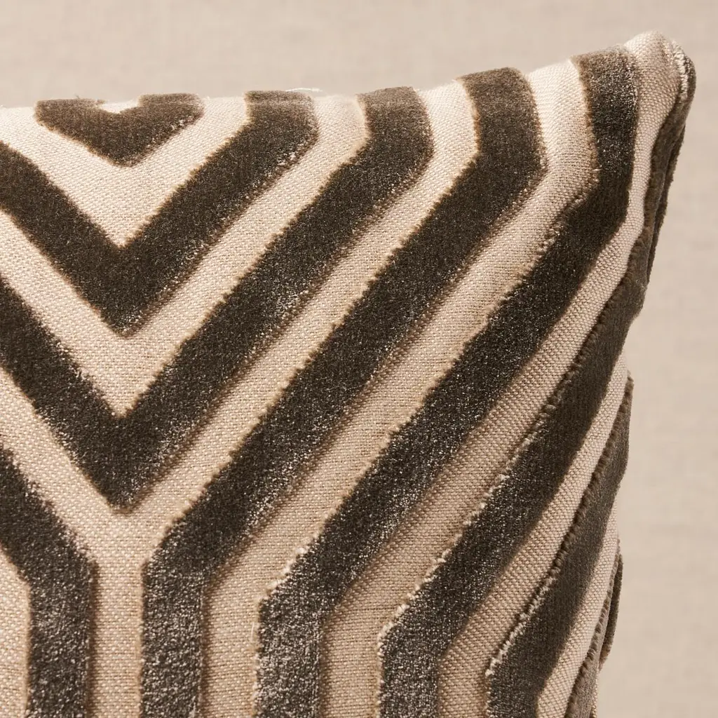 This pillow features Vanderbilt Velvet by Mary McDonald for Schumacher with a knife edge finish. A large-scale, linear design gives this Italian cut velvet fabric a graphic sensibility. The silk-like pile adds extra dimension and a luxurious hand to this upholstery woven. Pillow includes a feather/down fill insert and hidden zip closure.