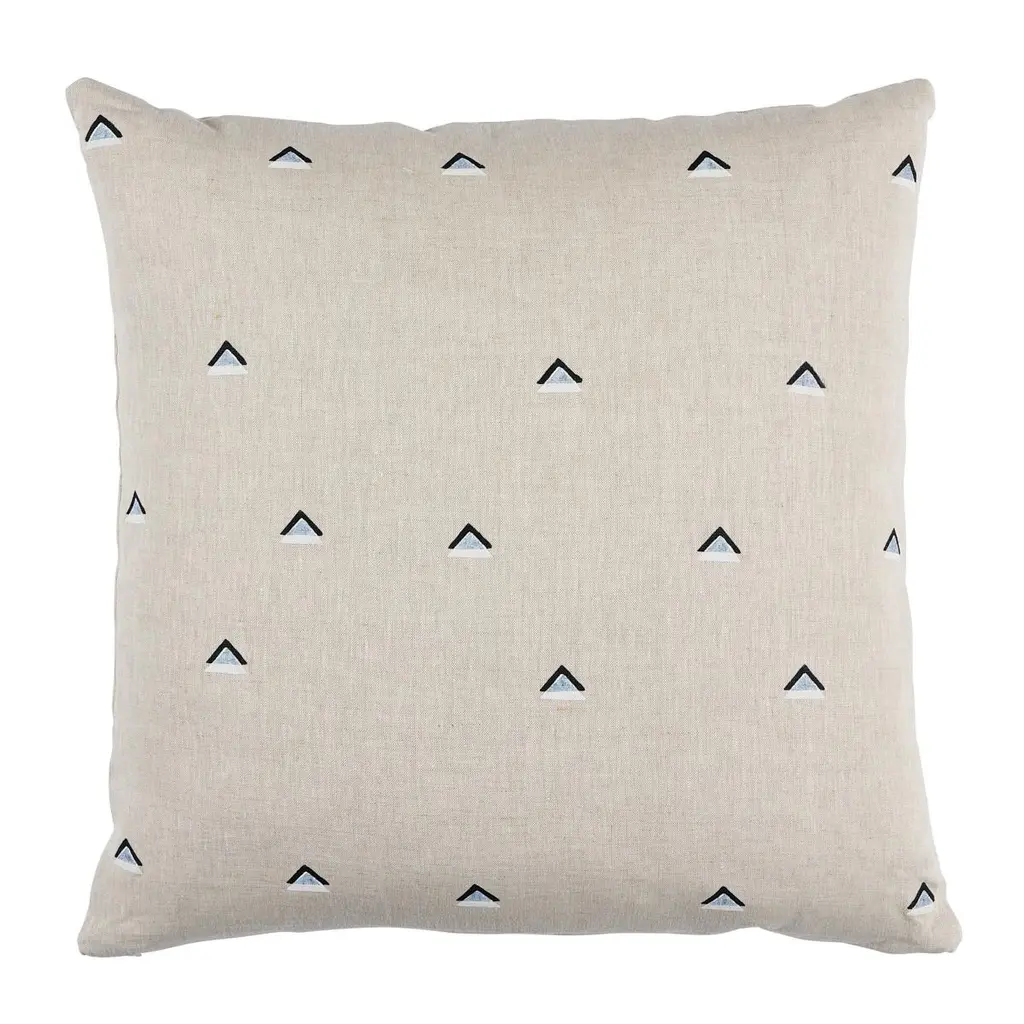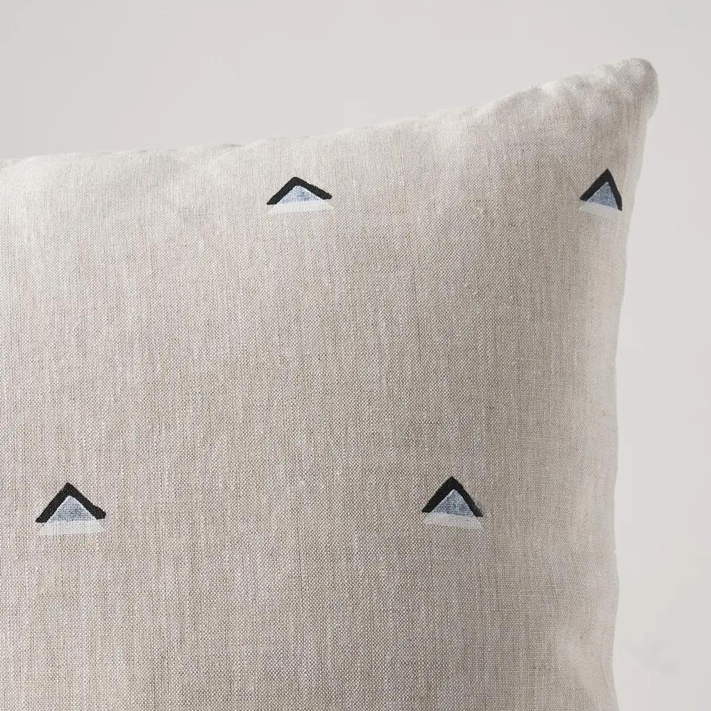 This pillow features Overlapping Triangles by Caroline Z Hurley with a knife edge finish. Designed by Caroline Z Hurley in her Brooklyn studio and block-printed in New Bedford, Massachusetts.. Each shape is cut and individually stamped onto the linen by hand. Pillow includes a feather/down fill insert and hidden zipper closure. Dry Clean Recommended